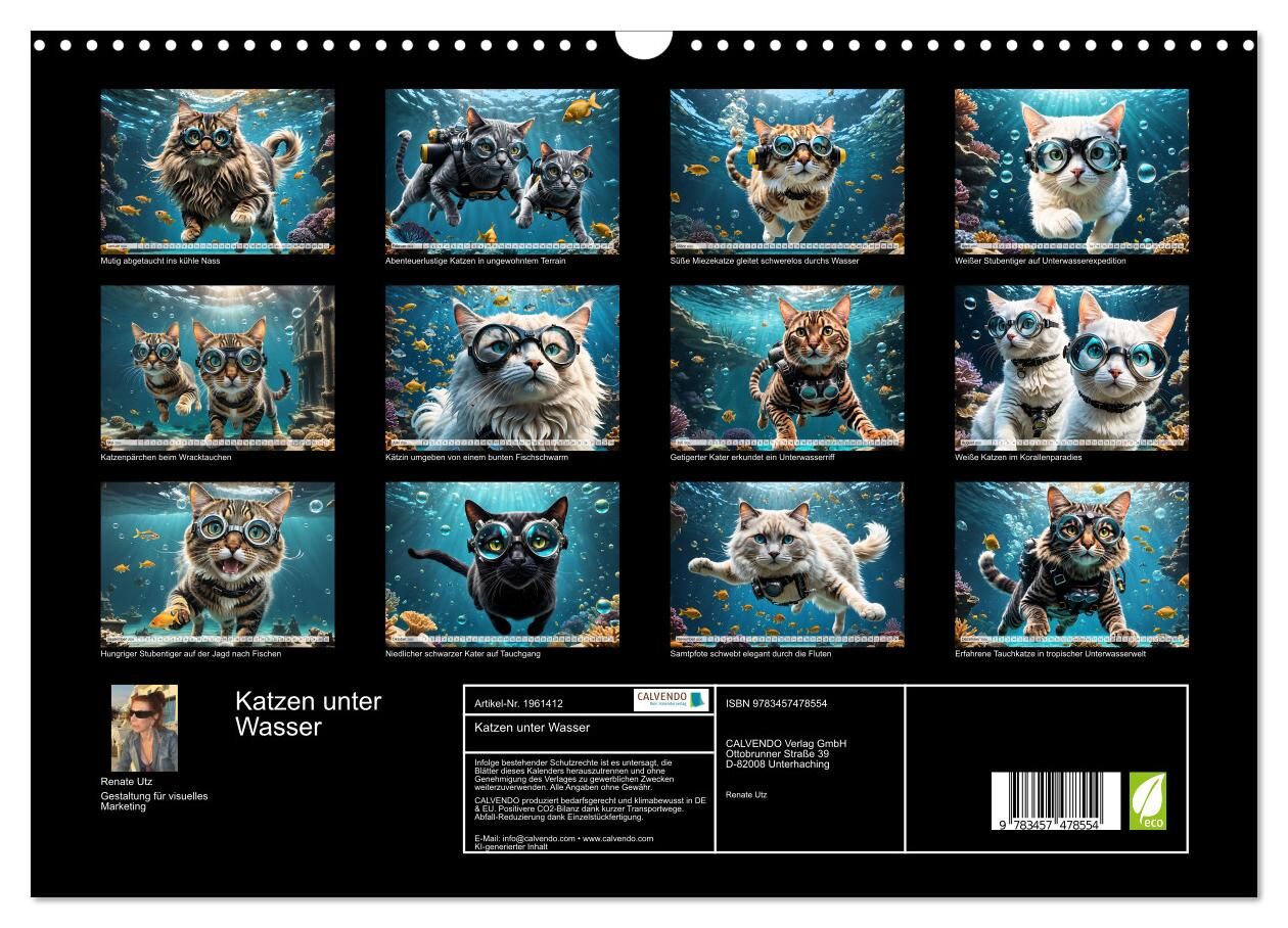Von wegen wasserscheu, diese bezaubernden Stubentiger haben das kühle Nass und den Tauchsport für sich entdeckt. Der einzigartige, mit KI erstellte Katzenkalender von Renate Utz präsentiert erheiternde Bilder von mutigen Miezekatzen, die neugierig und elegant ...