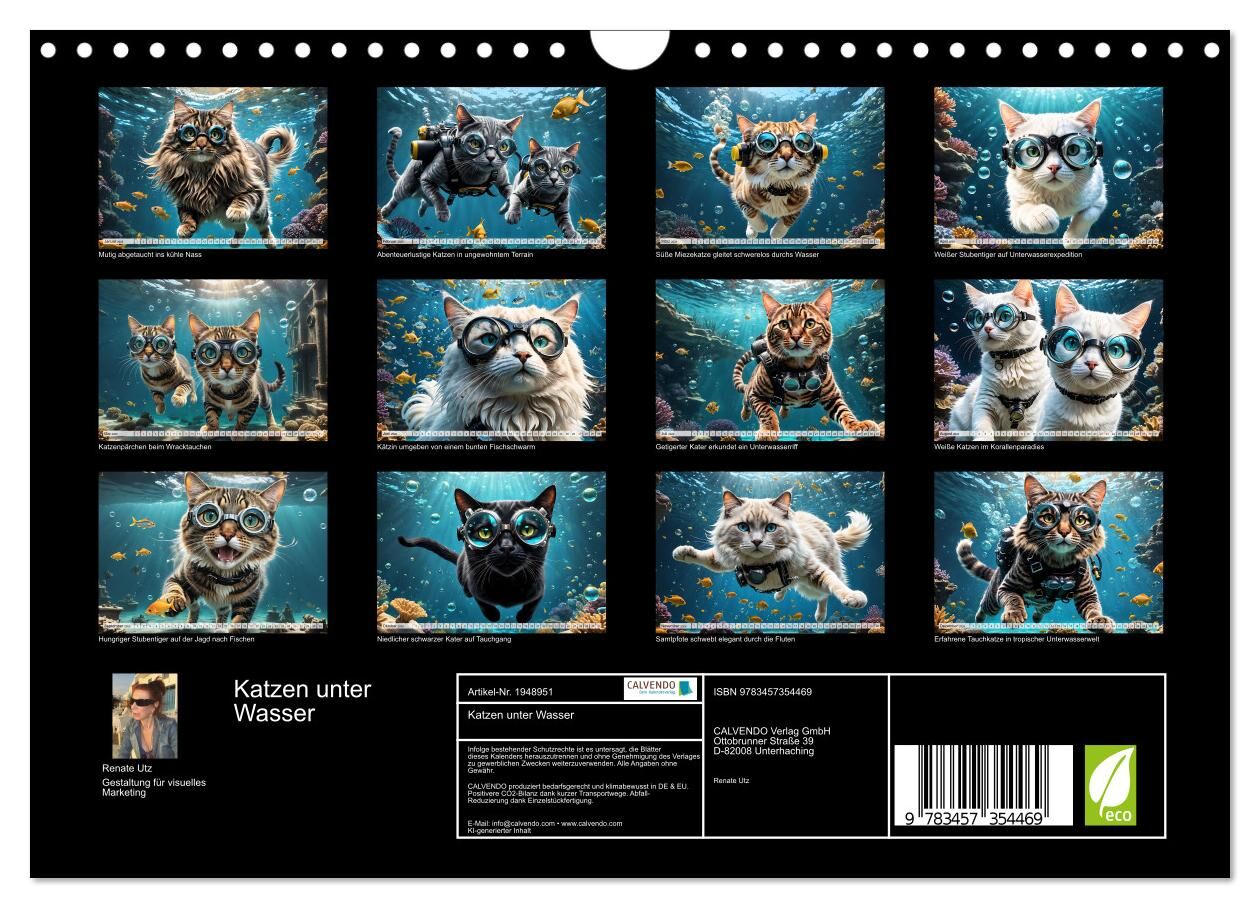 Von wegen wasserscheu, diese bezaubernden Stubentiger haben das kühle Nass und den Tauchsport für sich entdeckt. Der einzigartige, mit KI erstellte Katzenkalender von Renate Utz präsentiert erheiternde Bilder von mutigen Miezekatzen, die neugierig und elegant ...
