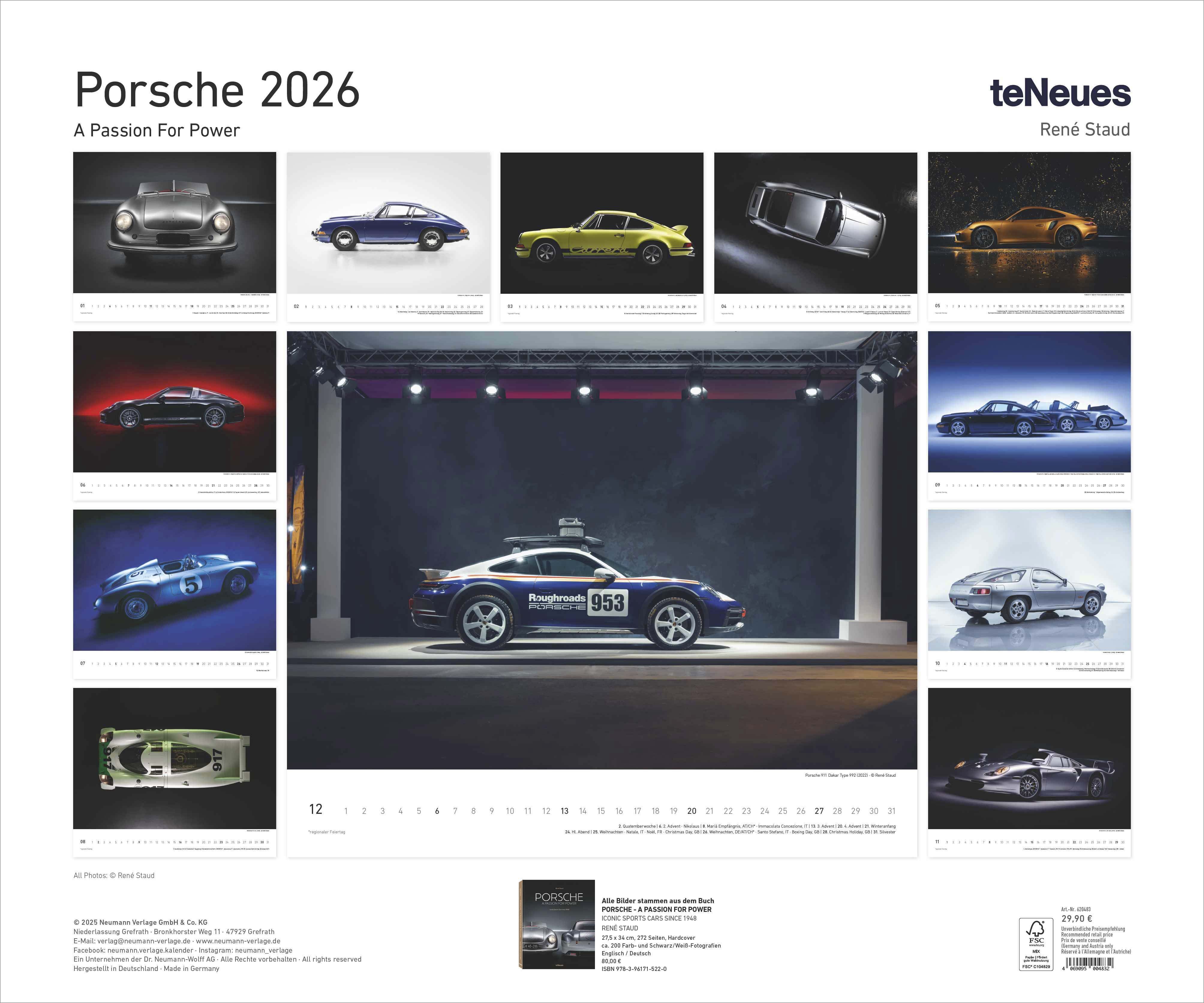 Der teNeues Porsche A Passion for Power 2026 Wandkalender ist eine Hommage an die legendären Fahrzeuge aus Zuffenhausen. Meisterhaft fotografiert von René Staud , einem der renommiertesten Automobilfotografen weltweit, bringt dieser Kalender die Faszination P...