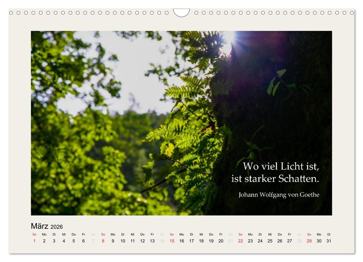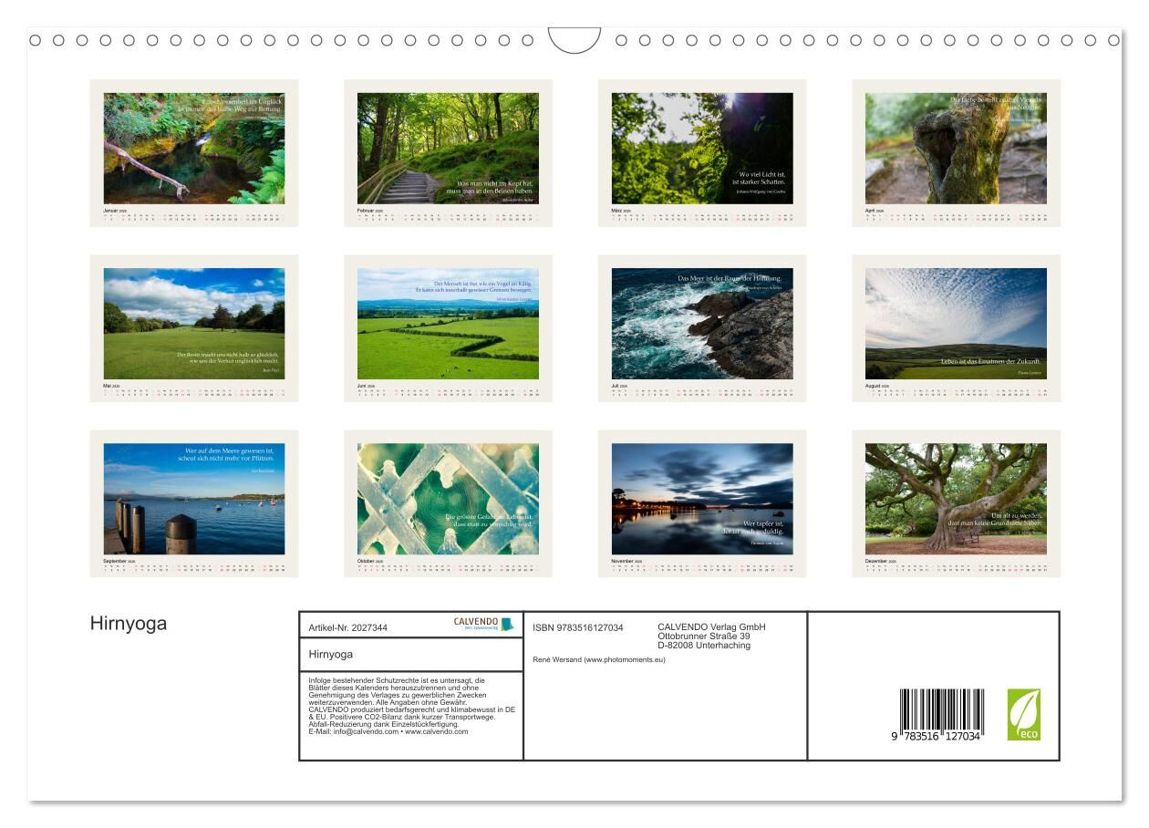 Mentales Yoga in Form eines Kalenders. Jeden Monat regt ein neuer Spruch Sie zum Nachdenken an. Dabei gilt die Devise: Sie dürfen nachdenken, müssen aber nicht. Sie können auch ganz einfach die ausdrucksstarken Fotos geniessen.