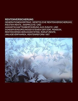 Quelle: Wikipedia. Seiten: 127. Kapitel: Generationenvertrag, Gesetzliche Rentenversicherung, Riester-Rente, Anspruchs- und Anwartschaftsüberführung aus Zusatz- und Sonderversorgungssystemen der DDR, Pension, Rentenversicherungssystem, Rürup-Rente, Umlageverfa...Quelle: Wikipedia. Seiten: 127. Kapitel: Generationenvertrag, Gesetzliche Rentenversicherung, Riester-Rente, Anspruchs- und Anwartschaftsüberführung aus Zusatz- und Sonderversorgungssystemen der DDR, Pension, Rentenversicherungssystem, Rürup-Rente, Umlageverfahren, Rentenreform 1957, Versicherungsnummer, Soziale Sicherung in Mauritius, Rentenlücke, Verminderte Erwerbsfähigkeit, Rentenanpassungsformel, Entgeltumwandlung, Rente wegen Todes, Soziale Sicherung in Nepal, Altersrente, Eigenheimrente, Regelaltersrente, Social Security, Durchschnittsentgelt, Alters- und Hinterlassenenversicherung, Rentenalter, Kindererziehungszeit, Rentenbesteuerung, Landwirtschaftliche Alterskasse, Anrechnungszeit, Variable Annuitäten, Hinzuverdienstgrenzen, Versorgungsanstalt des Bundes und der Länder, Mackenroth-These, Fremdrentengesetz, Renteneintrittsalter, Anspruchs- und Anwartschaftsüberführungsgesetz, Leibrente, Unverfallbarkeit, Berücksichtigungszeit, Aktueller Rentenwert, Berufsständische Versorgung, Unisex-Tarif, Unterstützungskasse, DUK Versorgungswerk, Sozialversicherung, Nachhaltigkeitsrücklage, Alterssicherung der Landwirte, Rentenniveau, Contractual Trust Arrangement, Kontenklärung, Arbeitsgemeinschaft kommunale und kirchliche Altersversorgung, Zusatzversorgungskasse, Sterbevierteljahr, Waisenrente, Eckrentner, Freiwillige Beiträge, Entgeltpunkte, Zusatzversorgungskasse des Kommunalen Versorgungsverbands Baden-Württemberg, Versicherungsfremde Leistungen, Beitragserstattung in der Rentenversicherung, Invaliditätspension, Sechstes Buch Sozialgesetzbuch, Beitragszeit, Wartezeit, Hinterbliebenenleistungen, Vorzeitige Wartezeiterfüllung, Zugangsfaktor, Versorgungsehe, Bundesknappschaft, Garantierente, Ghettorentengesetz, Forschungsdatenzentrum der Rentenversicherung, Pflichtbeitragszeit, Gesamtleistungsbewertung, Kirchliche Zusatzversorgungskasse des Verbandes der Diözesen Deutschlands, Ersatzzeit, Renten Service der Deutschen Post AG, Kirchliche Zusatzversorgungskasse Rheinland-Westfalen, Nachhaltigkeitsfaktor, Rentenartfaktor, Umwandlungssatz, Ida May Fuller, Rentenneurose, Allgemeines Sozialversicherungsgesetz, Rentensplitting, Rentier, Zurechnungszeit, Berufsschutz, Beitragsgeminderte Zeiten, Rentenformel, Mindestzinssatz, Gemeinsame Service-Stellen für Rehabilitation, Metallrente, Rentenbezugsdauer, Rückdeckungsversicherung, Sozialversicherungsanstalt der Bauern, Beitragsfreie Zeiten, Rentenfonds der Russischen Föderation, Evangelische Zusatzversorgungskasse, Mütterunterstützung, Versicherungslastregelung, Rentnerschwemme, Demografischer Faktor, Ansparphase, Rentenversicherung der Arbeiter, Aufschubzeit, Rentenrechtliche Zeiten, Rentenversicherungsträger, Rentenbezugsmitteilung, Central Provident Fund, Eichel-Rente, Erziehungsrente, Sozialversicherungsanstalt der gewerblichen Wirtschaft, Rententräger. Auszug: Die gesetzliche Rentenversicherung (GRV) in Deutschland ist Bestandteil (Versicherungszweig) des gegliederten Sozialversicherungssystems zur Alterssicherung der abhängig Beschäftigten, die im Wesentlichen durch deren per Gesetz vorgeschriebene Teilnahme im Umlageverfahren finanziert wird, sowie weiterer Personen, die der Versicherungspflicht unterliegen, freiwillig Beiträge zahlen oder als versichert gelten. Wer Beiträge aufgrund einer Versicherungspflicht oder einer freiwilligen Versicherung einzahlt, bezahlt damit die Renten der aus dem Arbeitsleben Ausgeschiedenen und erwirbt einen Anspruch auf seine eigene Rente (Generationenvertrag). D...