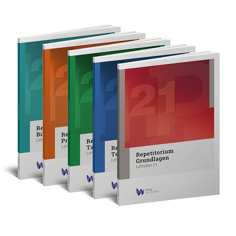 Gesamtunterlage Repetitorium Anwendungskompetenzen für den Lehrplan 21. Das Set besteht aus 5 Lehrmitteln; Repetitorium Grundlagen, Repetitorium Textverarbeitung, Repetitorium Tabellenkalkulation, Repetitorium Präsentation und Repetitorium Bilder, Video und Au...