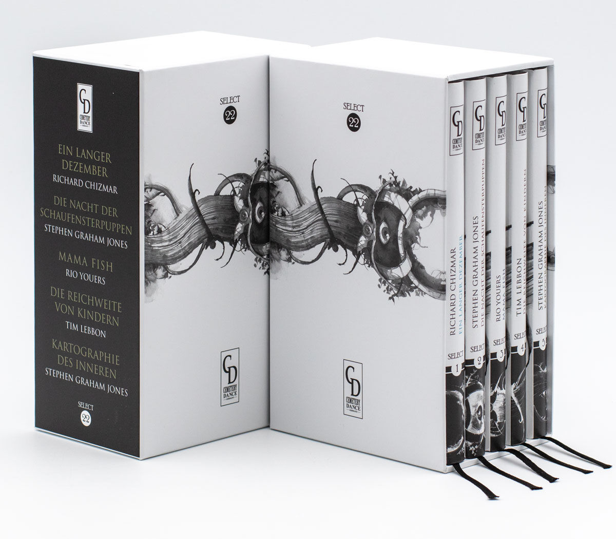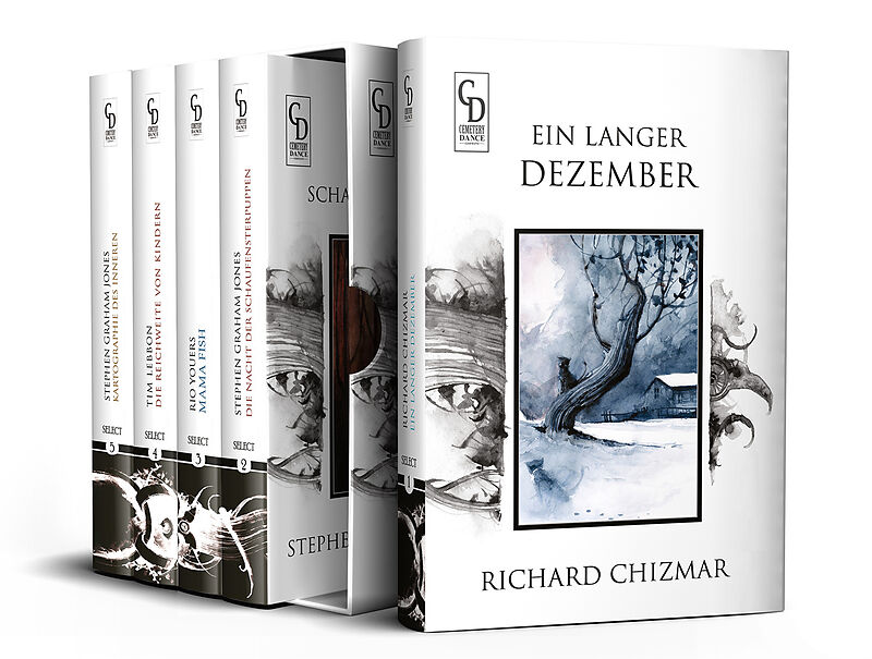 Die Schuberausgabe von Cemetery Dance SELECT 22 enthält die folgenden fünf Bände im Sammlerschuber: Band 1: Ein Langer Dezember von Richard Chizmar (ISBN: 978-3-946330-22-6) Band 2: Die Nacht der Schaufensterpuppen von Stephen Graham Jones (Bram Stoker Award: ...