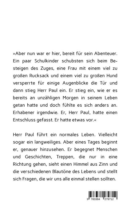 »Aber nun war er hier, bereit für sein Abenteuer. Ein paar Schulkinder schubsten sich beim Besteigen des Zuges, eine Frau mit einem viel zu großen Rucksack und einem viel zu großen Hund versperrte für einige Augenblicke die Tür und dann stieg Herr Paul ein. Er...