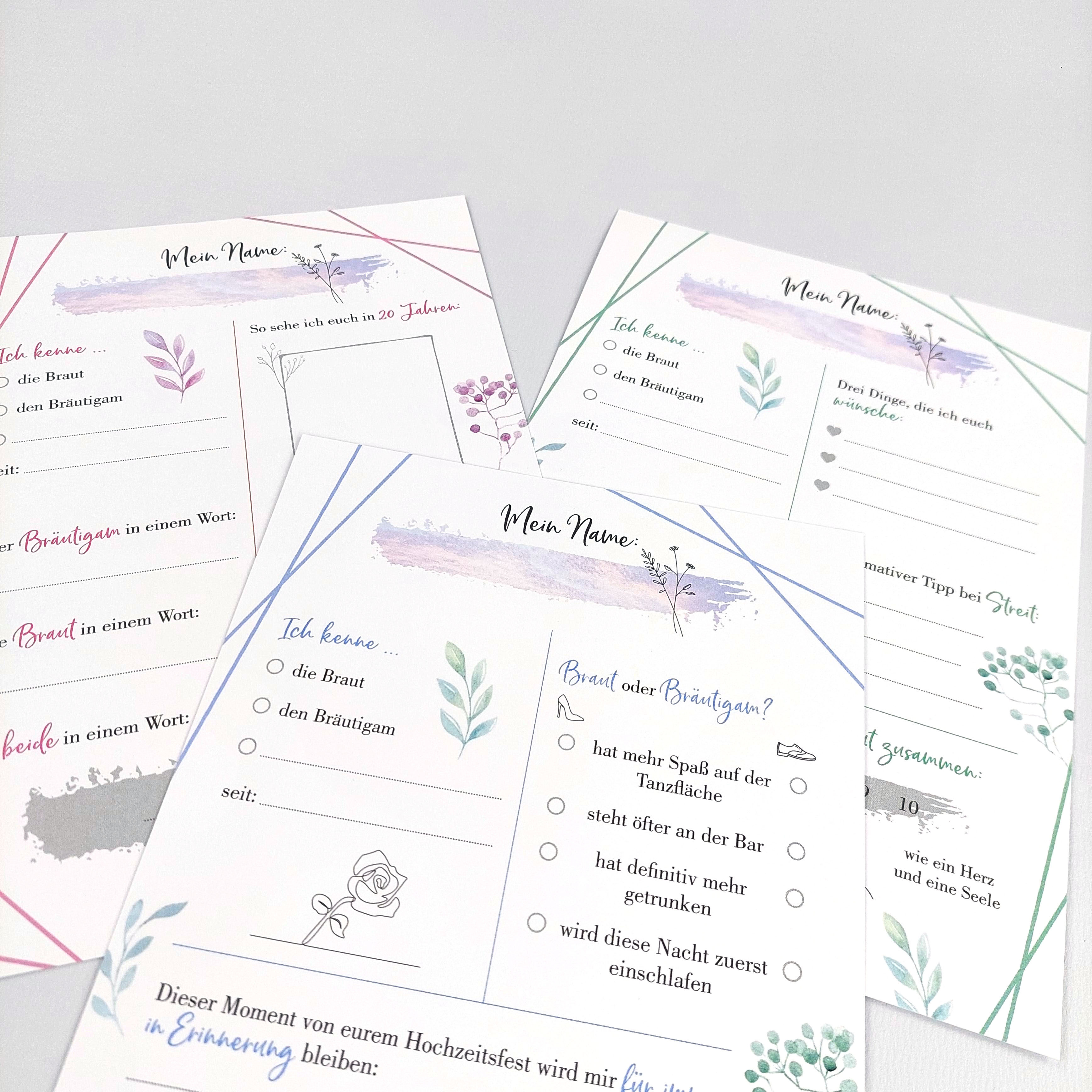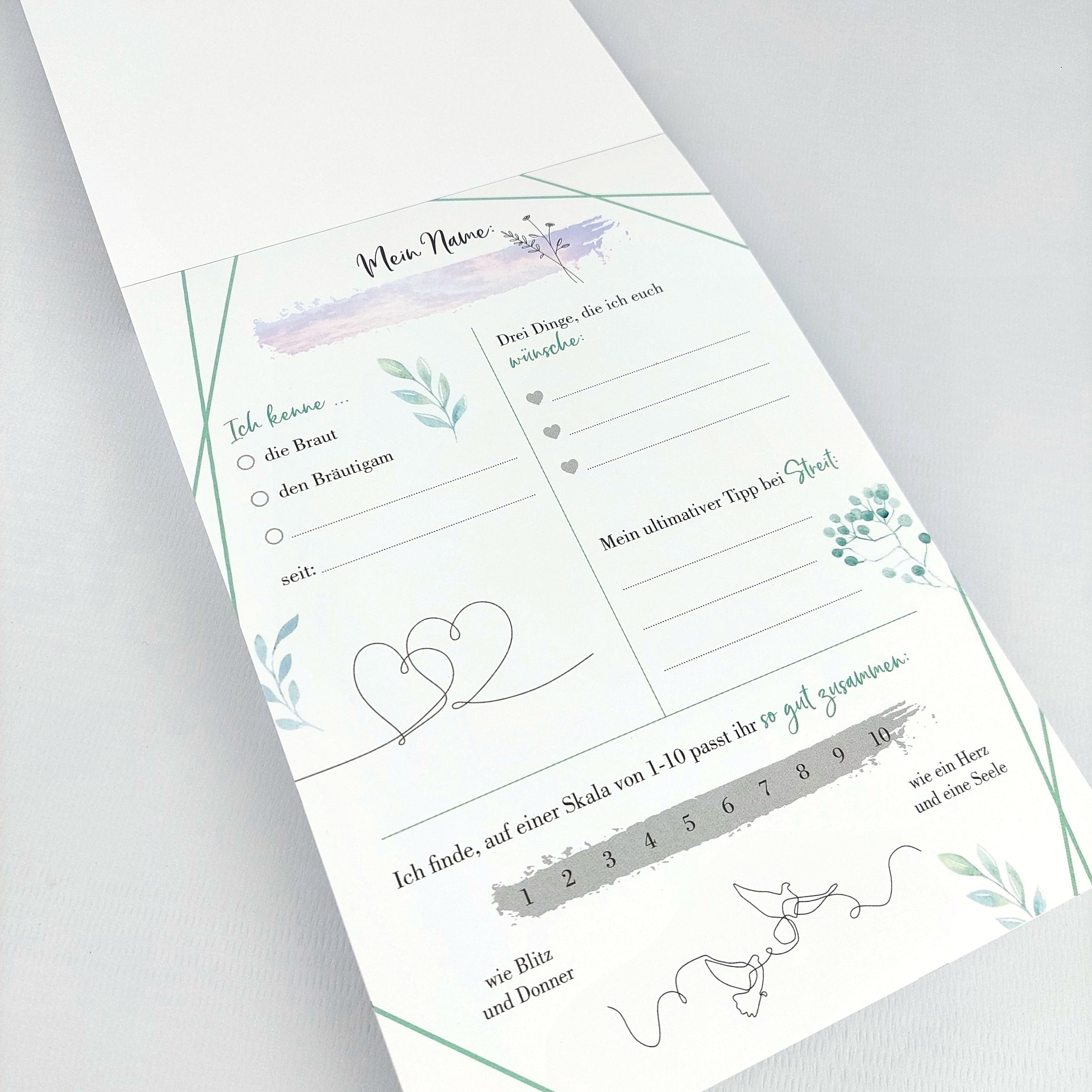 Während ein herkömmliches Gästebuch früher oder später im Regal verschwindet, können diese Gästekarten kreativ in Szene gesetzt werden: Als Collage in einem großen Bilderrahmen oder aufgehängt an Memoboards, Pinnwänden oder stylischen Fotoseilen werden sie zu ...
