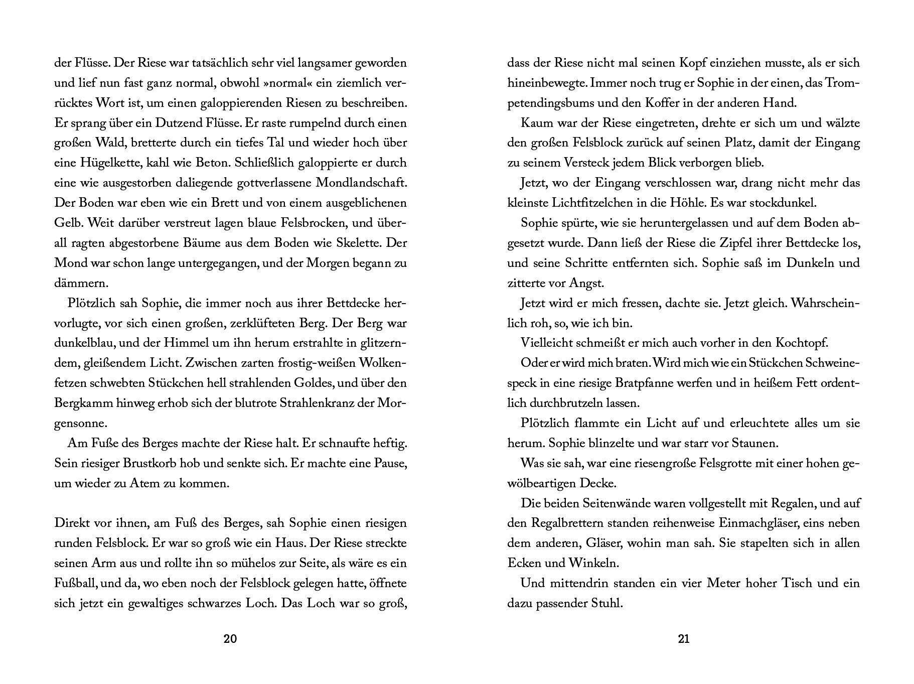 Ein bemerkenswert freundlicher Riese »Was für Menschen isst du denn am liebsten?«, fragte Sophie und hatte einen Kloß im Hals. »Ich«, brach es aus dem Riesen hervor, so laut, dass die Einmachgläser im Regal klirrten. »Ich und Leberwesen verschlingeln! Nie und ...