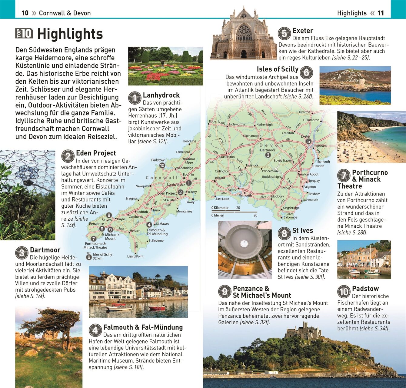 Klar strukturiert: Im bewährten TOP10-Prinzip werden die beliebtesten Sightseeing-Orte und Unternehmungen in Cornwall und Devon kurz und knackig aufbereitet.
