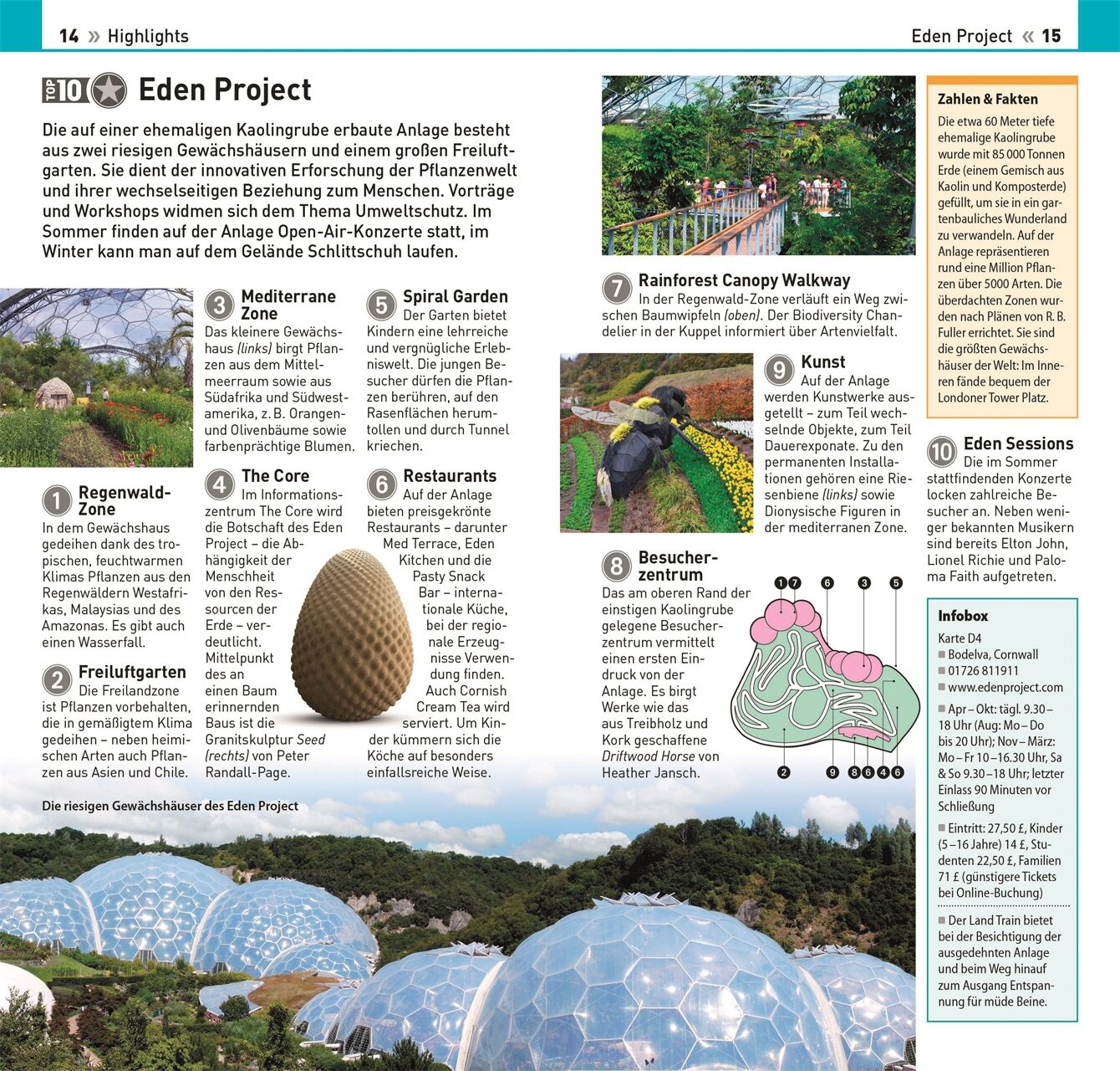 Von der einzigartigen Pflanzenwelt des Eden Projects über die hügelige Heide- und Moorlandschaft Dartmoor bis zum malerischen Saint Michael's Mount: Alle, die wenig Zeit auf ihrer Reise haben, führt der Reiseführer auf direktem Weg zu den 10 wichtigsten Sehenswürdigkeiten der Regionen Cornwall und Devon. Jede der TOP10-Attraktionen wird mit 10 spannenden Fakten, Details oder Tipps zum Besuch näher vorgestellt.