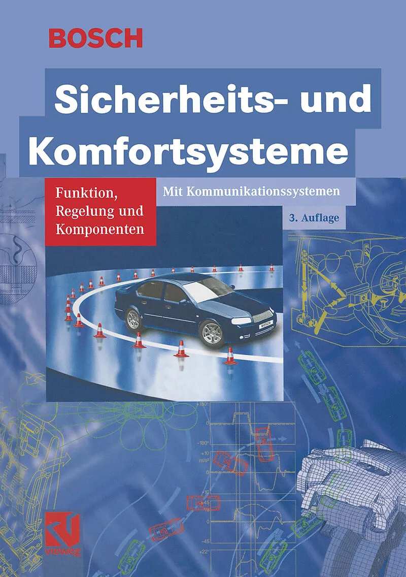 Fahrsicherheit im Kraftfahrzeug.- Sicherheitssysteme.- Grundlagen des Fahrens.- Grundlagen der Fahrphysik.- Reifen.- Kräfte und Momente am Fahrzeug.- Fahrzeuglängsdynamik.- Fahrzeugquerdynamik.- Definitionen.- Bremssysteme im Personenkraftwagen.- Übersicht.- Geschichte der Bremse.- Einteilung von Pkw-Brems- anlagen.- Bestandteile einer Pkw-Bremsanlage.- Bremskreisaufteilung.- Komponenten für Pkw-Bremsanlagen.- Übersicht.- Bremspedal.- Bremskraftverstärker.- Hauptzylinder.- Ausgleichsbehälter.- Vordruckventil.- Bauteile für konventionelle Bremskraftverteilung.- Bremsleitungen.- Bremsschläuche.- Bremsflüssigkeit.- Radbremsen.- Übersicht.- Trommelbremsen.- Scheibenbremsen.- Bremsbeläge und Bremsscheiben.- Anitblockiersystem ABS.- Systemübersicht.- Anforderungen an das ABS.- Dynamik des gebremsten Rades.- ABS-Regelkreis.- Typische Regelzyklen.- Raddrehzahlsensoren.- Antriebsschlupfregelung ASR.- Aufgaben.- Funktionsbeschreibung.- Struktur der ASR.- Typische Regelsituationen.- ASR für allradgetriebene Fahrzeuge.- Elektronisches Stabilitäts-Programm ESP.- Anforderungen.- Aufgaben und Arbeitsweise.- Fahrmanöver.- Gesamtregelkreis und Regelgrößen.- Mikromechanische Drehratesensoren.- Lenkradwinkelsensoren.- Hall-Beschleunigungs- sensoren.- Automatische Bremsfunktionen.- Übersicht.- Standardfunktion.- Zusatzfunktionen.- Hydroaggregat.- Entwicklungsgeschichte.- Aufbau.- Druckmodulation.- Elektrohydraulische Bremse SBC.- Aufgabe und Funktion.- Aufbau.- Arbeitsweise.- Adaptive Fahrgeschwindigkeitsregelung ACC.- Systemüberblick.- Abstandsradar.- ACC-Sensor & Control Unit.- Systemverbund.- Bedienung und Anzeige.- Detektion und Objektauswahl.- ACC-Regelung.- Weiterentwicklungen.- Elektronische Qetriebesteuerung.- Getriebe für Kraftfahrzeuge.- Anforderungen anGetriebe.- Getriebeausführungen.- Elektronische Getriebesteuerung.- Steuerung automatisierter Schaltgetriebe AST.- Steuerung von Automatikgetrieben.- Steuerung stufenloser Getriebe.- Positionssensor für Getriebesteuerung.- Getriebe-Drehzahlsensoren.- Elektrohydraulische Aktuatoren für Getriebesteuerung.- Anwendung und Aufgabe.- Anforderungen.- Aufbau und Arbeitsweise.- Aktuatorausführungen.- Module für Getriebesteuerung.- Anwendung.- Modulausführungen.- Aktivlenkung.- Aufgabe.- Aufbau.- Arbeitsweise.- Sicherheitskonzept.- Nutzen der Aktivlenkung für den Fahrer.- Insassenschutzsysteme.- Sicherheit am Kraftfahrzeug.- Sicherheitsgurte, Gurtstraffer.- Frontairbag.- Seitenairbag.- Komponenten.- Überrollschutzsysteme.- Ausblick.- Piezoelektrische Beschleunigungssensoren.- Oberflächenmikro- mechanische Beschleunigungssensoren.- Sitzbelegungserkennung.- Fahrerassistenzsysteme.- Kritische Fahrsituationen.- Unfallursachen, Maßnahmen.- Einsatzgebiete.- Sicherheit und Komfort.- Elektronische Rundumsicht.- Einparksysteme.- Einparkhilfe mit Ultraschallsensoren.- Weitere Entwicklungsschritte.- Ultraschallsensoren.- Antriebsund Verstellsysteme.- Fensterantriebe.- Dachantriebe.- Sitz- und Lenkradverstellung.- Heizung und Klimatisierung.- Elektronische Heizungsregelung.- Elektronisch geregelte Klimaanlage.- Fahrzeugsicherungssysteme.- Akustische Signalgeräte.- Zentralverriegelung.- Schließsysteme.- Biometrische Systeme.- Instrumentierung.- Informations- und Kommunikationsbereiche.- Fahrerinformationssysteme.- Kombiinstrumente Kl.- Display-Ausführungen.- Analoge Signalübertragung.- Analoge Rundfunksysteme.- Größen und Einheiten.- Nachrichtenübermittlung mit Hochfrquenzwellen.- Elektromagnetische Verträglichkeit EMV.- Satellitengestützte Nachrichtenübermittlung.-Digitale Signalübertragung.- Digitale Rundfunksysteme.- Radio Data System (Rundfunkzusatzdienst).- Digital Audio Broadcasting DAB.- Digital Multimedia Broadcasting DMB.- Digital Radio Mondial DRM.- Orientierungsmethoden.- Orientierung.- Ortung.- Navigation.- Mobil- und Datenfunk.- Telekommunikationsnetze.- Komponenten und Struktur.- Mobilfunknetze.- Datenfunknetze.- Audioanlagen.- Autoradio.- Zusatzeinrichtungen.- Autoantennen.- Aufgabe.- Radioantennen.- Mobilfunkantennen.- Navigationsantennen.- Verkehrsfunksysteme.- Aufgabe.- Verkehrsfunkkanäle.- Navigationssysteme.- Aufgabe.- Anwendung.- Arbeitsweise.- Piezoelektrischer Stimmgabel-Drehratesensor.- Verkehrstelematik.- Definition.- Aufgabe.- Struktur und Arbeitsweise.- Flottenmanagement.- Transporte und Dienstleistungen.- Unterhaltung und Information in Bussen.- Werkstatt-Technik.- Werkstattgeschäft.- Diagnose in der Werkstatt.- Prüf- und Testgeräte.- Bremsenprüfung.- Redaktionelle Kästen.- 61 Reaktions- und Anhalteweg.- 65 Bosch-Prüfzentrum Boxberg.- 79 Bewertungskriterien für Pkw-Scheibenbremsbeläge.- 109 Grundlagen der Regelungstechnik.- 123 Einspurmodell.- 131 Miniaturen.- 141 Fahrstabilität.- 145 ABS-Ausführungen.- 149 Entwicklung der Hydroaggregate.- 177 Radar-Geschichte(n).- 243 Getriebegeschichte(n).- 281 Geschichte des Sicherheitsgurtes.- 327 Der blaue Punkt: Autoradio-Geschichte(n).- 359 Kfz-Informationssystem.- 367 Mikromechanik.- 375 Unterhaltung im Automobil.