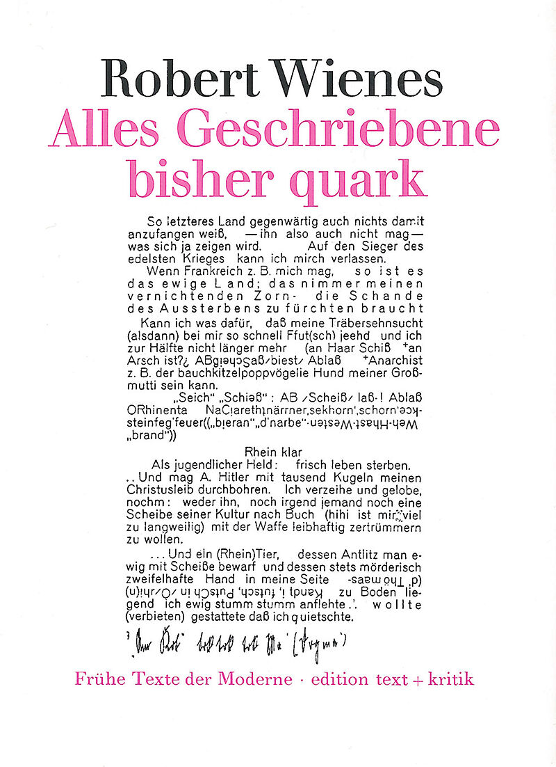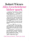 Der Prosatext "Alles Geschriebene bisher quark" ist in nur in einem Exemplar erhalten. Das Heft ist durch "Sicherungsverwahrung" bei der Gestapo und später bei der Stasi auf die Nachwelt gekommen und wurde hier erstmals als Faksimile veröff...Der Prosatext "Alles Geschriebene bisher quark" ist in nur in einem Exemplar erhalten. Das Heft ist durch "Sicherungsverwahrung" bei der Gestapo und später bei der Stasi auf die Nachwelt gekommen und wurde hier erstmals als Faksimile veröffentlicht. Eine gattungsspezifische Einordnung des Textes ist schwierig. Er ist in sechs Kapitel gegliedert, doch sind diese Kapitel gefüllt mit Laut- und Satzfragmentkaskaden, kaum verständlichen Wortspielen, Anagrammen, Verschreibungen und Klangassoziationen. Formale Strukturen verschiedenster Gattungen und Genres lassen sich aufzeigen, intertextuelle Bezüge, die allerdings nur andeutungsweise hergestellt werden, verstärken den Montagecharakter des Textes. Eine narrative Struktur oder diskursive Entwicklung eines Textgeschehens oder einer Handlung ist nicht erkennbar. Seine Sprache enthält Anklänge ans Niederrheinische. Vermutlich hat Robert Wienes, über dessen Biografie nichts weiter bekannt ist, Berufserfahrungen als Setzer oder Buchdrucker gehabt. Als Wortkünstler experimentiert er mit der Sprache ähnlich wie etwa James Joyce, Kurt Schwitters, Otto Nebel oder Arno Schmidt.