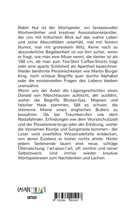 Robin Hut ist der Wortspieler, ein fantasievoller Wortverdreher und kreativer Assoziationskünstler, der uns mit kritischem Blick auf das wahre Leben und seine Absonderlichkeiten unterhält, mal mit subtilem Humor, mal mit groteskem Witz. Keine Absurdität ist vo...