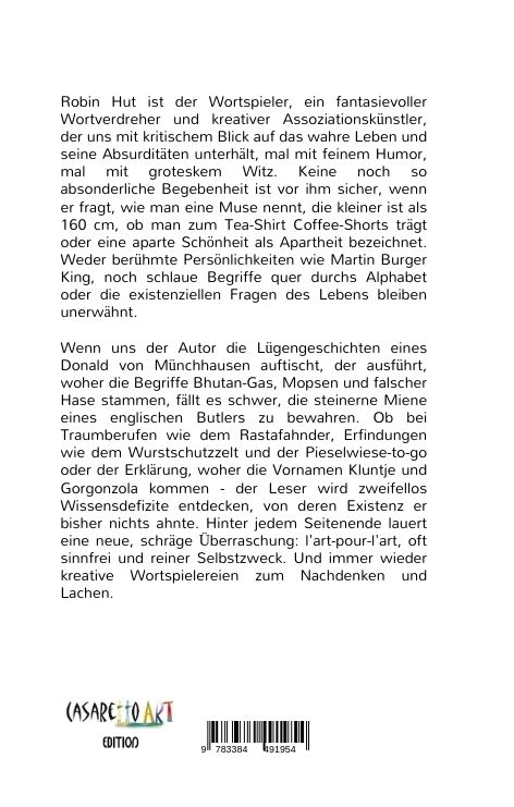 Robin Hut ist der Wortspieler, ein fantasievoller Wortverdreher und kreativer Assoziationskünstler, der uns mit kritischem Blick auf das wahre Leben und seine Absonderlichkeiten unterhält, mal mit subtilem Humor, mal mit groteskem Witz. Keine Absurdität ist vo...