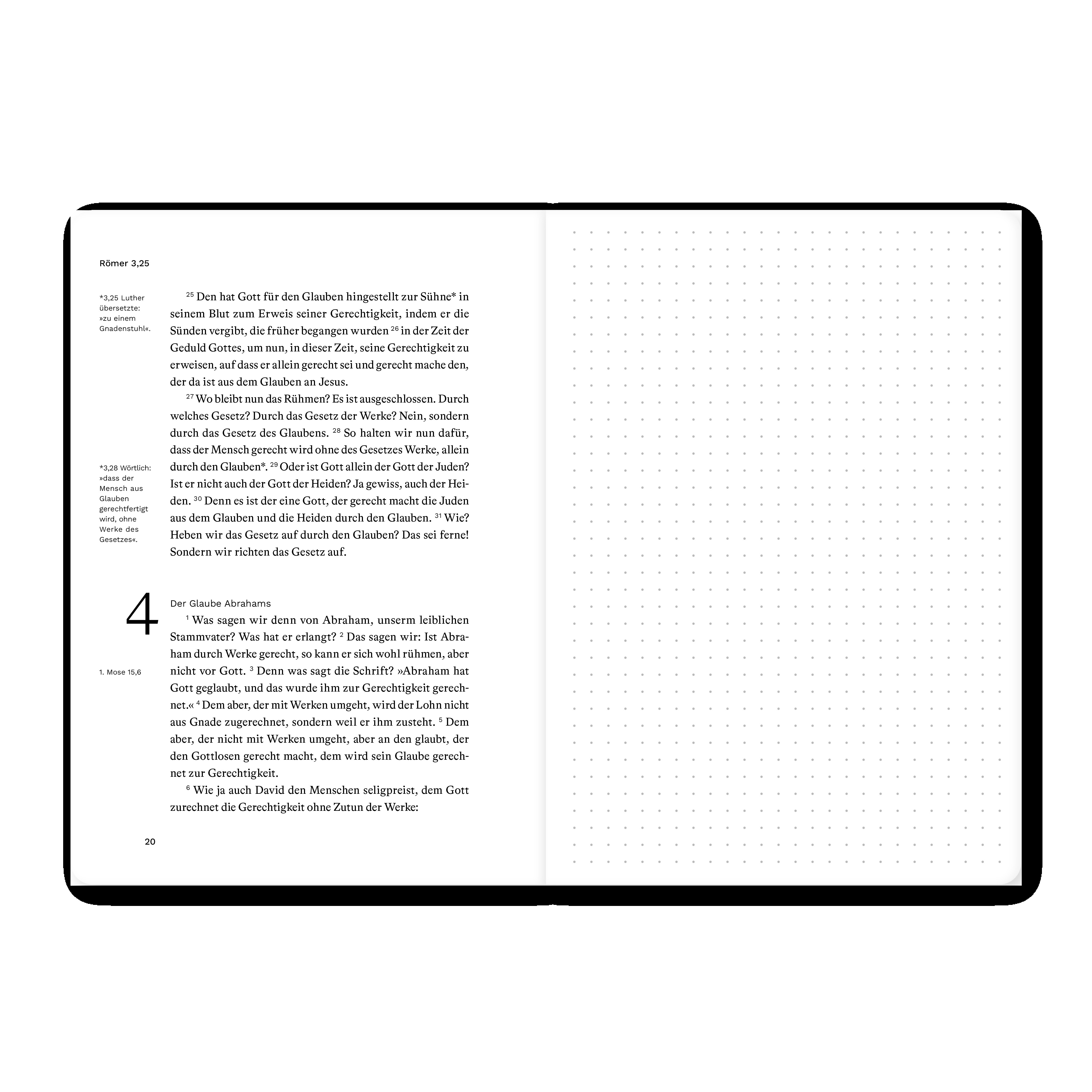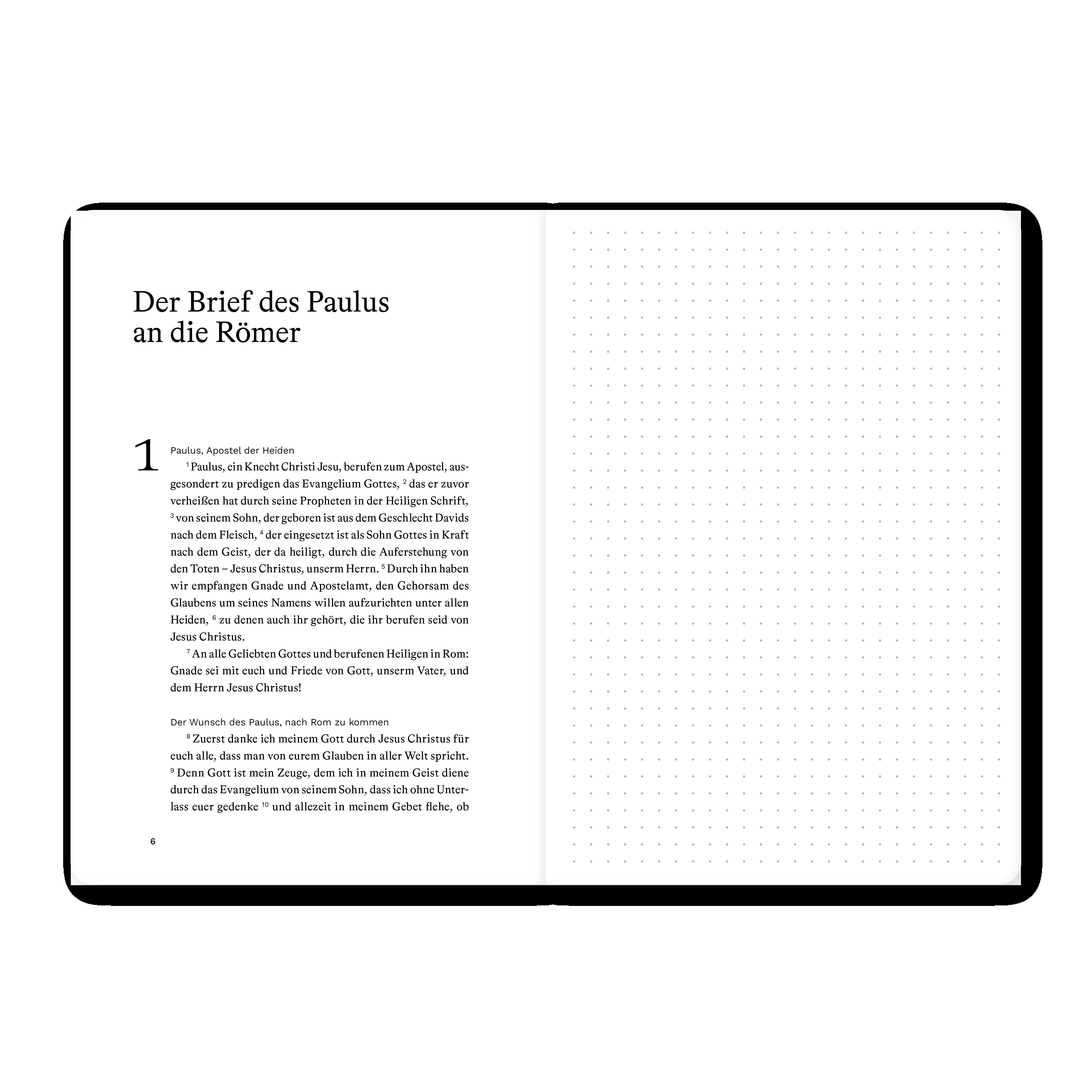 Bibeltext und Notizseite mit Punktraster ideal für die Bibellese, Kleingruppe oder Predigt. Hochwertig ausgestattet, viel Platz zum Schreiben. Dieses Bibeljournal kombiniert den vollständigen Bibeltext eines biblischen Buches (Luther 2017) und eine gegenüberli...