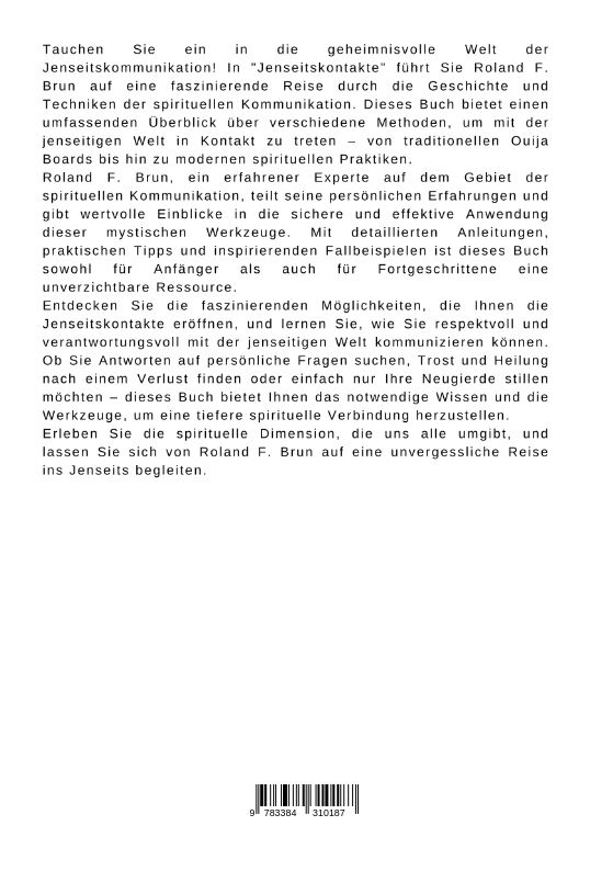 Tauchen Sie ein in die geheimnisvolle Welt der Jenseitskommunikation! In "Jenseitskontakte" führt Sie Roland F. Brun auf eine faszinierende Reise durch die Geschichte und Techniken der spirituellen Kommunikation. Dieses Buch bietet einen umfassenden Überblick ...