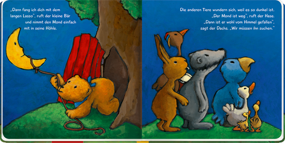 Der kleine Bär liebt den Mond über alles. Er ist sein bester Freund. Aber er ist sooo weit weg! Da hat der kleine Bär eine Idee - er fängt den Mond vom Himmel und nimmt ihn mit in seine Höhle ... Mit dieser Geschichte begleitet der kleine Mondbär die Kleinsten...