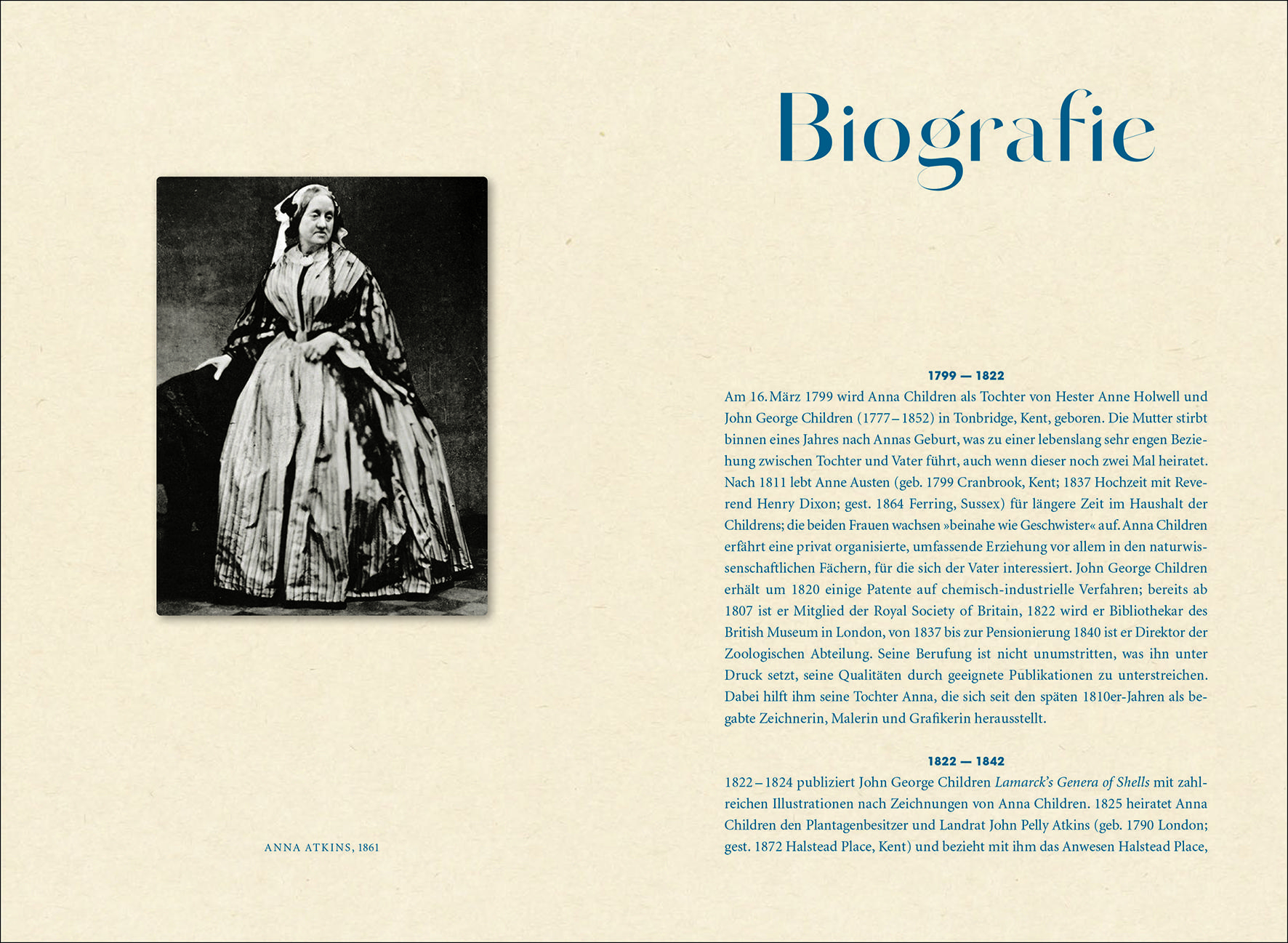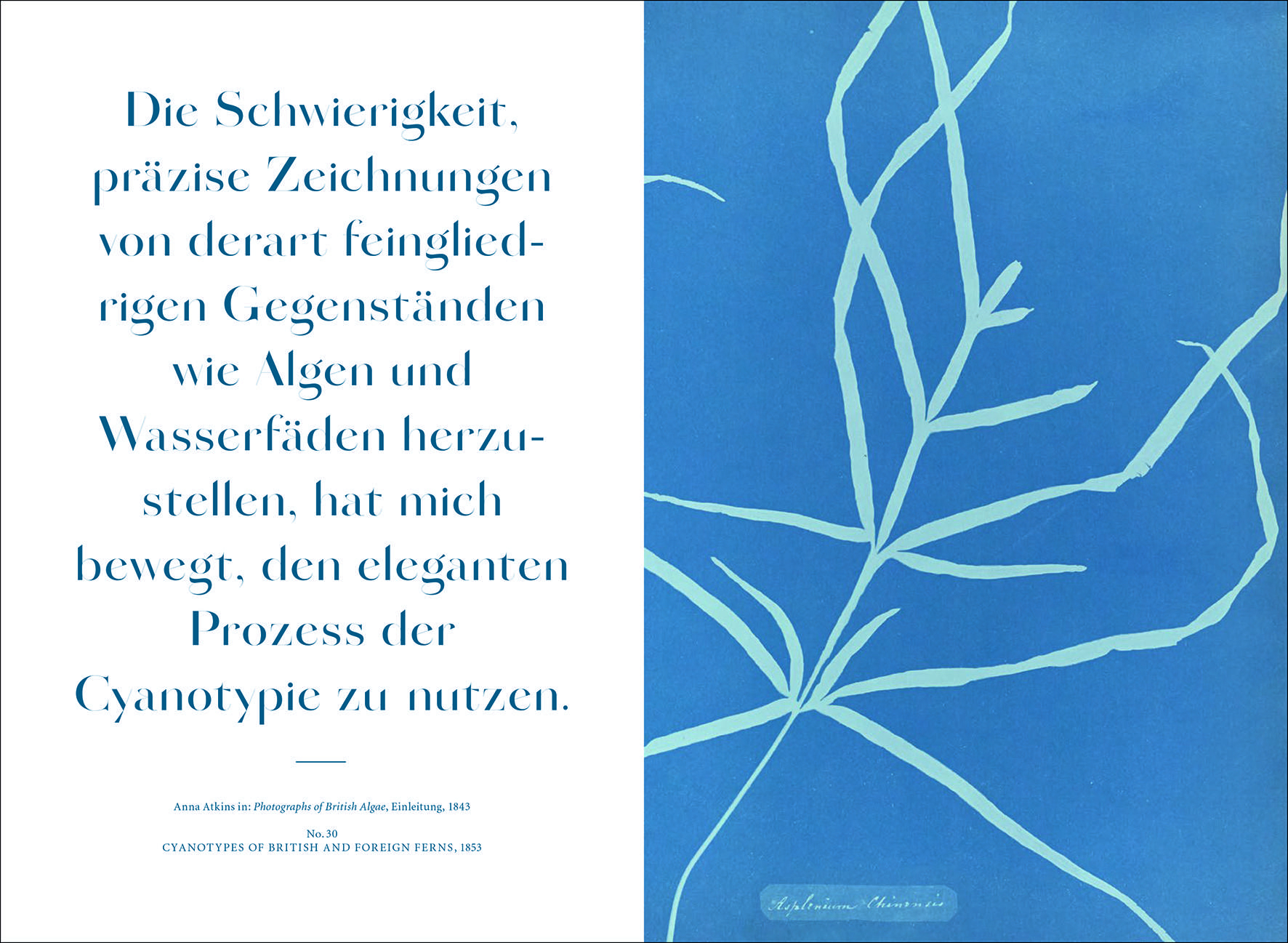Die englische Zeichnerin Anna Atkins (17991871) war in jeder Hinsicht eine moderne Frau. Für die Publikation ihrer Pflanzensammlungen nutzte sie die neueste Technik, die eben erst erfundene Cyanotypie. Damit schuf sie 1843 das erste Fotobuch der Geschichte, mi...