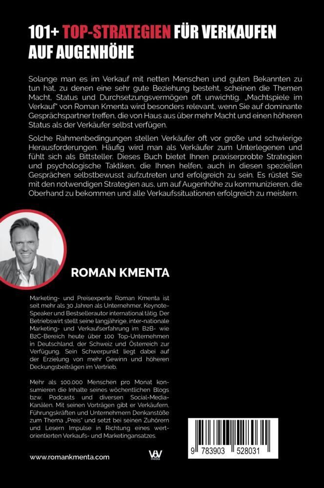 So führen Sie jedes Kundengespräch auf Augenhöhe Entdecken Sie die geheimen Taktiken der Verkaufspsychologie und erfahren Sie, wie Sie in jedem Kundengespräch die Oberhand gewinnen. Machtspiele im Verkauf von Roman Kmenta enthüllt über 101 Strategien, die Ihne...