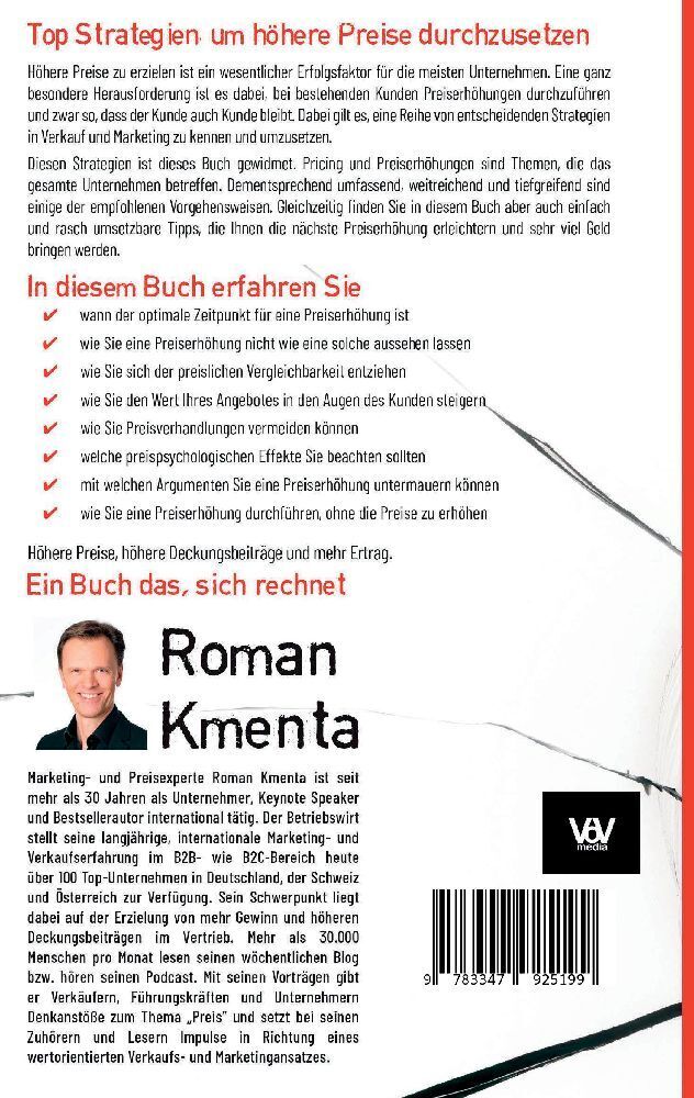 Sie wollen Ihre Preise erhöhen? So gelingt es! Sie fragen sich, wie Sie diese erfolgreich umsetzen? Sie wollen Ihre Kunden damit nicht verärgern? Und doch werden Preiserhöhungen von vielen Unternehmen zu spät oder gar nicht gemacht. Oft hat man Befürchtungen d...