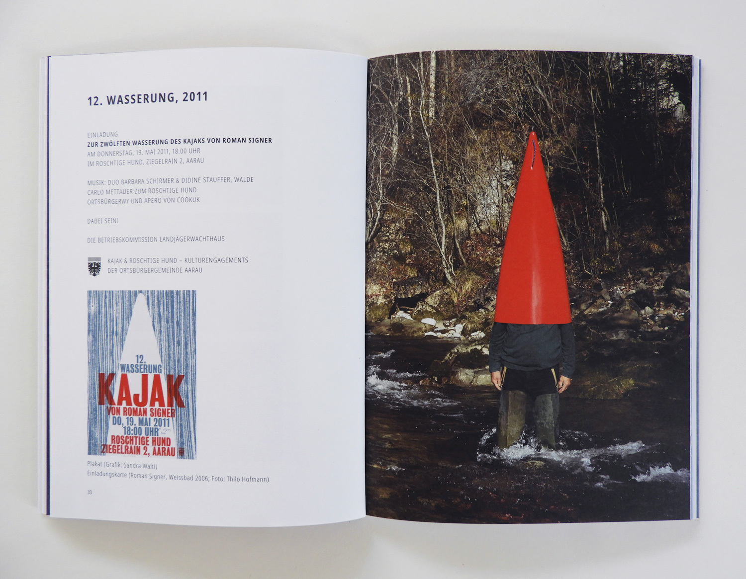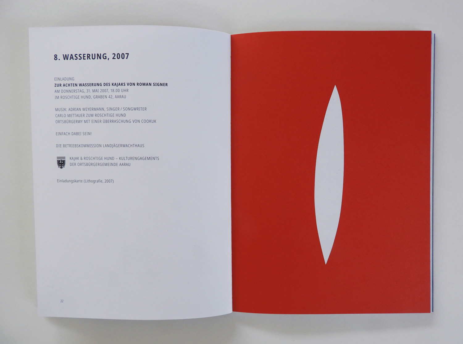 Seit 1999 wird das Kajak von Roman Signer einmal jährlich, jeweils im Mai, in der Schweizer Stadt Aarau gewässert. Am Nachmittag wird zu diesem Anlass der Stadtbach ab der Grabenquermauer abgestellt. Der Hauswart holt das Kajak aus dem Dachstock des Landjägerw...