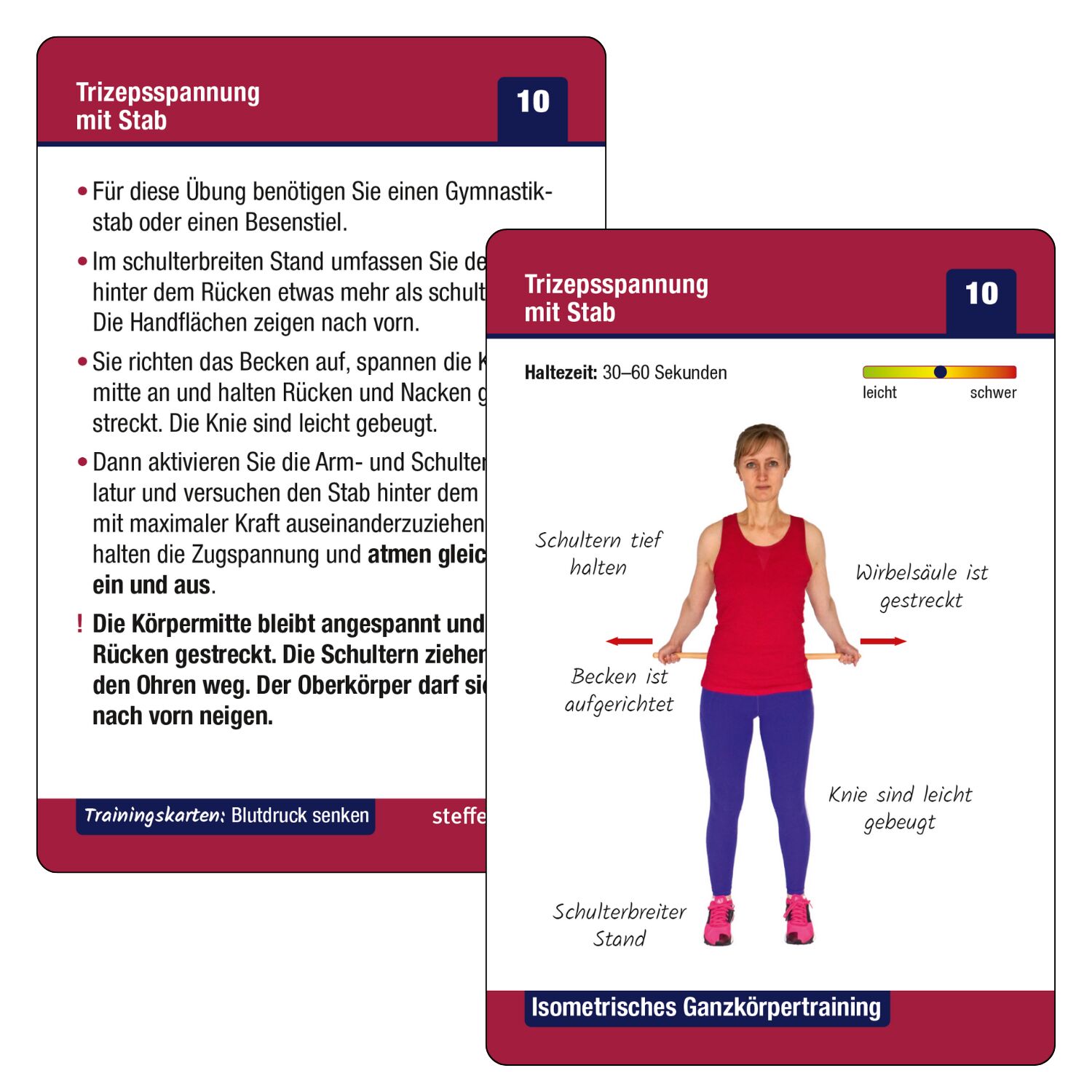Ihr kompakter Trainingsbegleiter : Die Trainingskarten enthalten 50 Übungen. Diese wurden speziell von Ronald Thomschke und Benno Paulitz entwickelt. Sie zielen darauf ab, Ihren Blutdruck zu senken und gleichzeitig Ihre Fitness zu verbessern.
