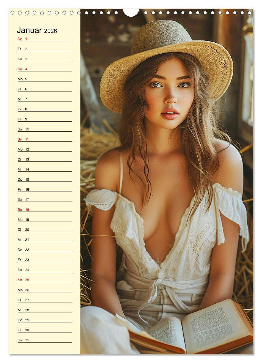 Tauchen Sie ein in die faszinierende Welt moderner Landmädchen, die Freiheit und Nostalgie verkörpern. Jeder Monat wurde mit Hilfe von KI erstellt und präsentiert eine neue, verführerische Seite dieser romantisch anmutenden Frauen. Mit Liebreiz und Charme brec...