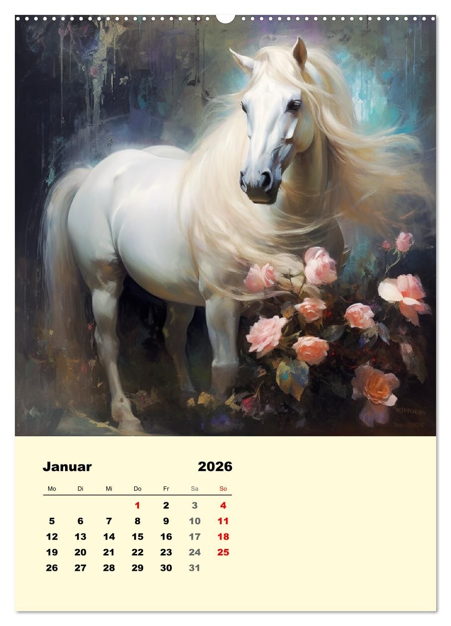 Pferde Gemälde sind eine zeitlose und elegante Dekoration, die nicht nur Pferdeliebhaber begeistert. Pferde sind würdevoll und majestätisch und dieser Kalender spiegelt ihre unglaubliche Schönheit wider. Diese romantisch-verträumten Pferdebilder wurden mit KI ...