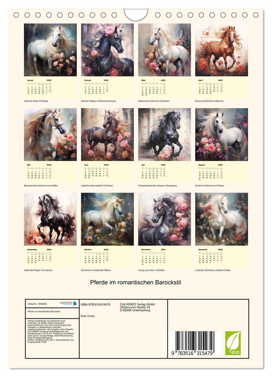 Pferde im romantischen Barockstil (Wandkalender 2026 DIN A4 hoch), CALVENDO Monatskalender