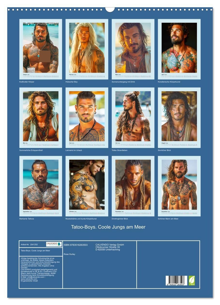 Entdecken Sie mit diesem Tattoo-Boys-Kalender die perfekte Verbindung von Kunst und Körper. Jeder Monat wurde mit Hilfe von KI erstellt und präsentiert einen schönen Mann mit tollen Tätowierungen vor der malerischen Kulisse des Strandes. Diese Illustrationen f...