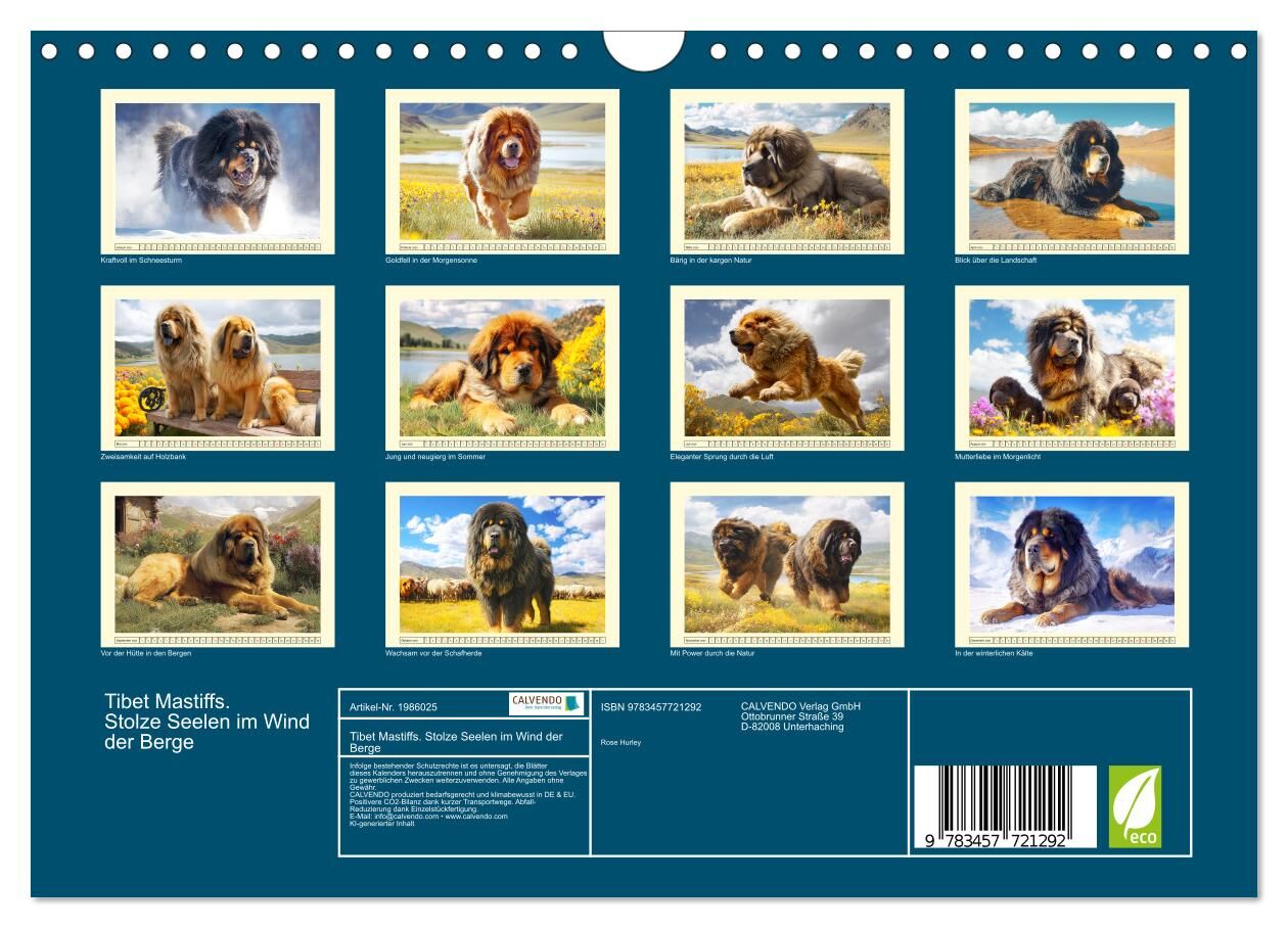 Dieser Kalender zeigt tolle Illustrationen des legendären Tibet Mastiffs eine der ältesten und geheimnisvollsten Hunderasse der Welt. Ursprünglich aus dem Himalaya stammend, gelten sie als Beschützer der Klöster und Wächter der Nomaden und Herden stolz, unabhä...