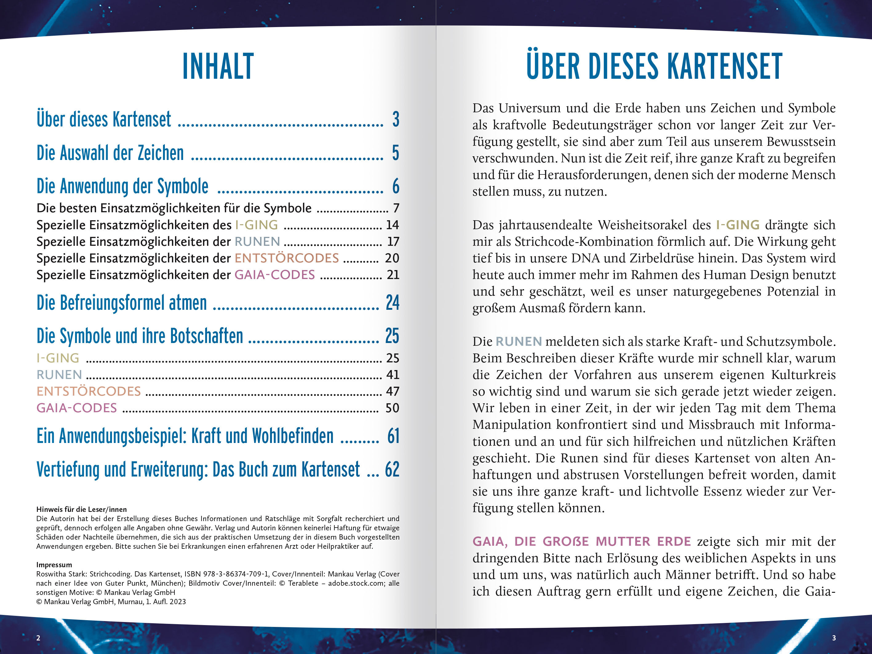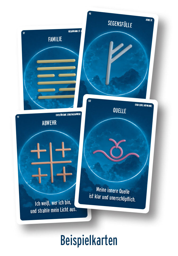 ÜBER DIESES KARTENSET Das Universum und die Erde haben uns Zeichen und Symbole als kraftvolle Bedeutungsträger schon vor langer Zeit zur Verfügung gestellt, sie sind aber zum Teil aus unserem Bewusstsein verschwunden. Nun ist die Zeit reif, ihre ganze Kraft zu begreifen und für die Herausforderungen, denen sich der moderne Mensch stellen muss, zu nutzen. Das jahrtausendealte Weisheitsorakel des I-GING drängte sich mir als Strichcode-Kombination förmlich auf. Die Wirkung geht tief bis in unsere DNA und Zirbeldrüse hinein. Das System wird heute auch immer mehr im Rahmen des Human Design benutzt und sehr geschätzt, weil es unser naturgegebenes Potenzial in großem Ausmaß fördern kann. Die RUNEN meldeten sich als starke Kraft- und Schutzsymbole. Beim Beschreiben dieser Kräfte wurde mir schnell klar, warum die Zeichen der Vorfahren aus unserem eigenen Kulturkreis so wichtig sind und warum sie sich gerade jetzt wieder zeigen. Wir leben in einer Zeit, in der wir jeden Tag mit dem Thema Manipulation konfrontiert sind und Missbrauch mit Informationen und an und für sich hilfreichen und nützlichen Kräften geschieht. Die Runen sind für dieses Kartenset von alten Anhaftungen und abstrusen Vorstellungen befreit worden, damit sie uns ihre ganze kraft- und lichtvolle Essenz wieder zur Verfügung stellen können. GAIA, DIE GROSSE MUTTER ERDE zeigte sich mir mit der dringenden Bitte nach Erlösung des weiblichen Aspekts in uns und um uns, was natürlich auch Männer betrifft. Und so habe ich diesen Auftrag gern erfüllt und eigene Zeichen, die Gaia-Codes, für die gute Erde und die Menschen, ihre Kinder und all ihre Geschöpfe erschaffen. Es ist höchste Zeit, miteinander und in Verbundenheit zu heilen. Die Gaia-Codes dienen speziell der Erdheilung und der Reinigung der Atmosphäre mit allem, was in und auf ihr lebt. Als weitere Kategorie habe ich einige ENTSTÖRCODES hinzugefügt; sie dienen speziell dazu, Widerstände und fremde Einflüsse bei der Heilarbeit mit Symbolen fernzuhalten. Sie haben insgesamt 144 kraftvolle Zeichen in diesem Kartenset zur Verfügung. Die Auswahl ist sehr einfach, die Anwendung für körperliche, seelische, geistige oder situative Anliegen auch. Ich freue mich sehr, dass Sie dieses Kartenset nutzen: in Würdigung, Wertschätzung und Dankbarkeit für die "Alten" - unsere Vorfahren - und in Ermutigung, Vertrauen und Inspiration für uns alle, die "Neuen". Viel Freude! Ihre Roswitha Stark