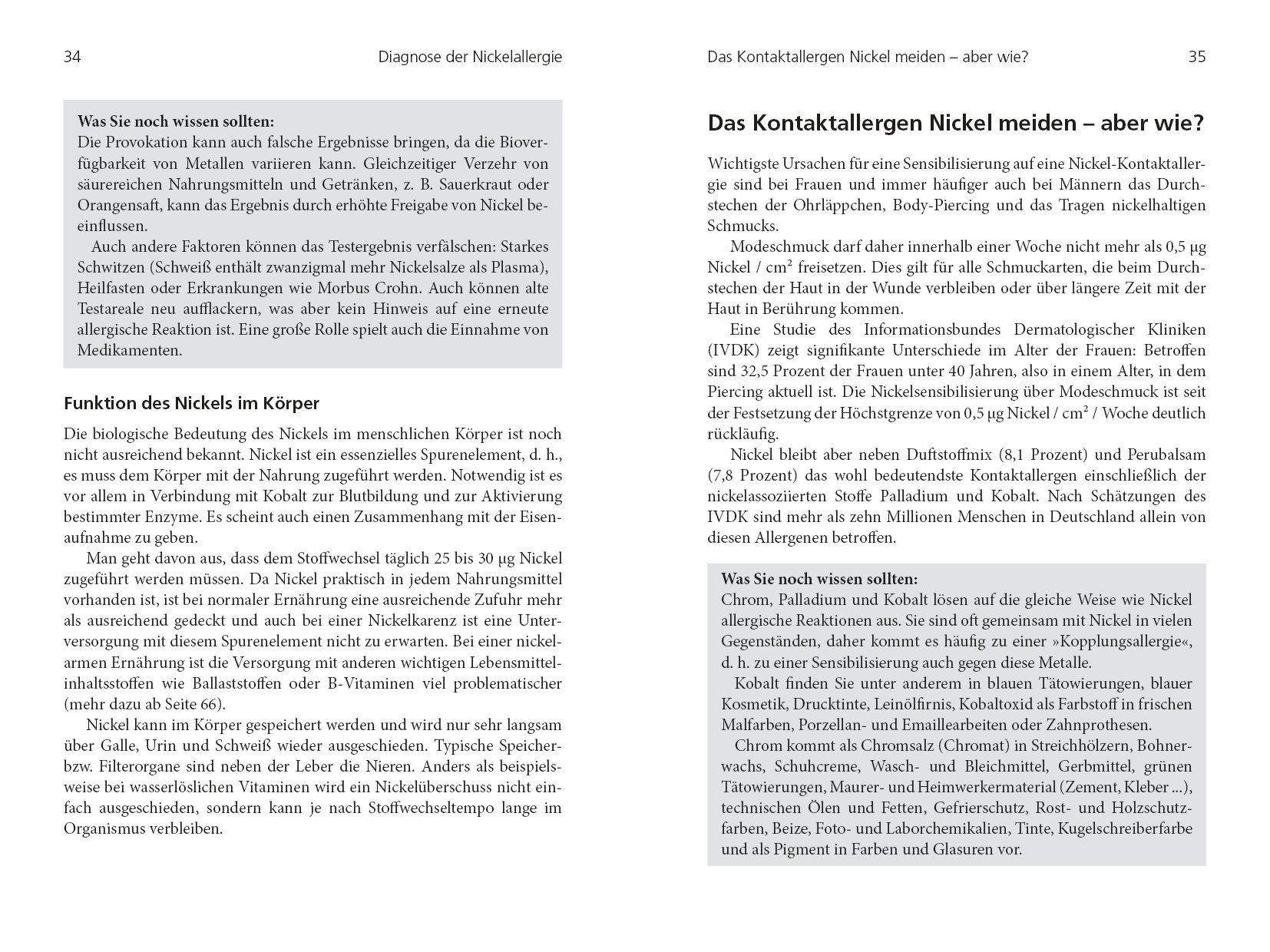 Nickel ist weltweit das häufigste Kontaktallergen. Als größte Risikofaktoren für die Entstehung einer Nickelallergie gelten das Ohrloch-Stechen, Piercing und Modeschmuck. Von Nickelallergie betroffene Menschen müssen nickelhaltige Gegenstände wie Schmuck, Bril...