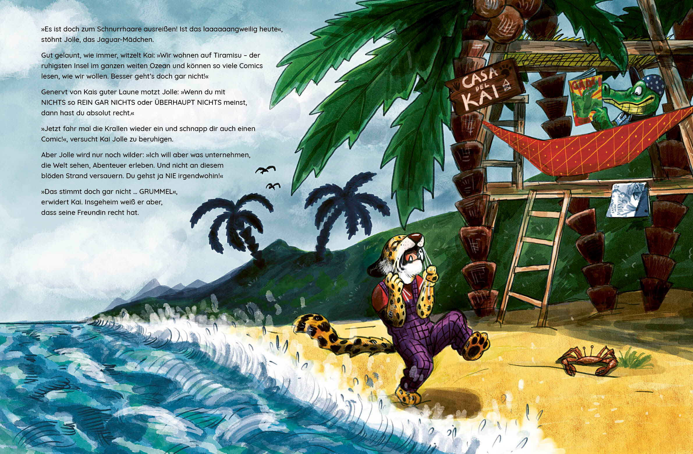 Das Jaguarmädchen Jolle hat heiße Füße. Das bedeutet, sie will unbedingt ein Abenteuer erleben. Ihr Mitbewohner Kai hingegen bekommt schnell kalte Füße, wenn er das Baumhaus verlässt. Er liest lieber Comics und sieht so spannende Dinge in der sicheren Hängemat...