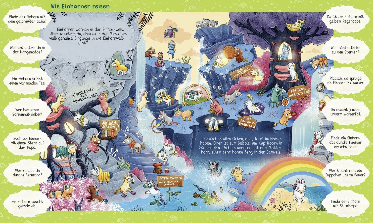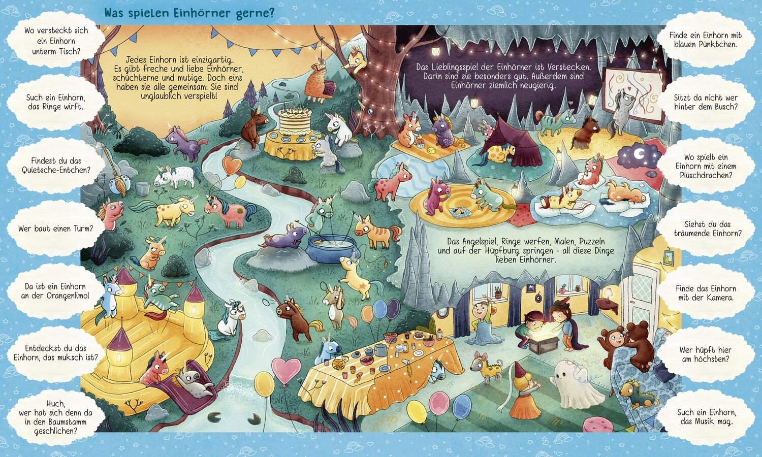 Willkommen in der fabelhaften Welt der Einhörner! Auf jeder Seite wuseln und flitzen kleine, große, schlafende, spielende, futternde und tanzende Einhörner durchs Bild. Wer findet das Einhorn beim Ringewerfen? Das Hörnchen mit dem Kleeblatt am Popo? Oder das a...
