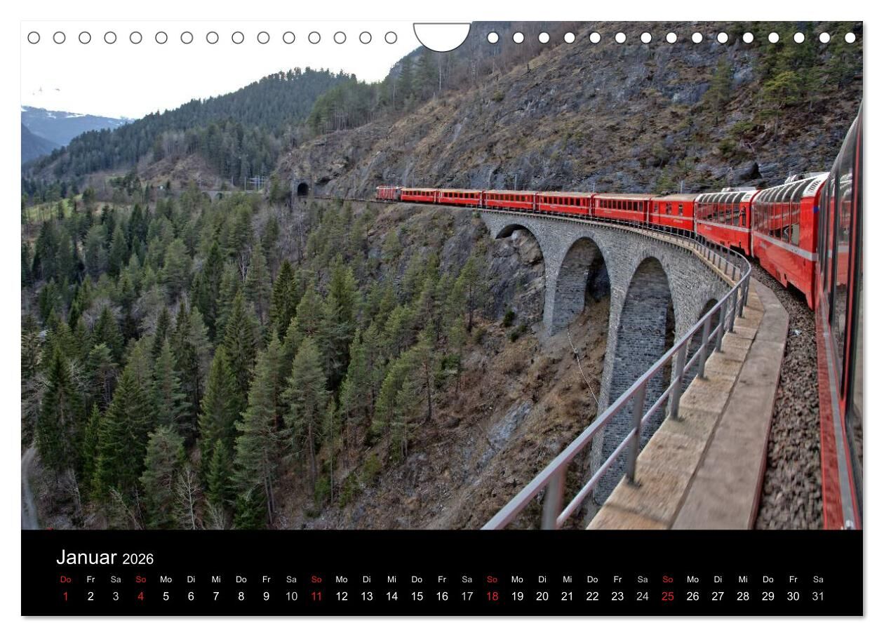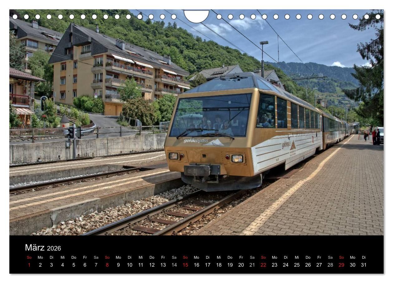 Hier finden sich Bilder der berühmten Züge der Schweiz. Unter anderem beinhaltet der Kalender Fotos des Glacier Express, des Bernina Express, der GoldenPass Line und viele mehr.