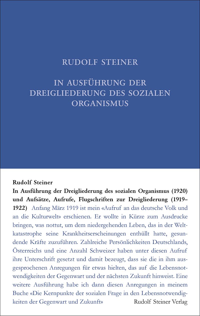 Das Schrifttum zur Dreigliederung jetzt chronologisch geordnet Die letzte Ausgabe des Bandes GA 24 ist 1982 erschienen. Für die neue, dritte Auflage wurde er vollständig überarbeitet; die Schrift «Gedanken während der Zeit des Krieges» wurde zusammen mit weiteren Texten zum Weltkriegsgeschehen ausgegliedert und dem in der Gesamtausgabe erschienenen Band GA 19 zugeordnet. Der Band trägt neu den Titel, den Rudolf Steiner selbst seiner 1920 zusammengestellten Aufsatzsammlung gegeben hat. Eine weitere wesentliche Neuerung ist die chronologische Anordnung der in dem Band GA 24 abgedruckten Aufsätze. So lässt sich nun der Weg von Rudolf Steiners öffentlichem Kampf für die Dreigliederung Jahr für Jahr mitverfolgen. Alle Texte wurden sorgfältig mit der Ausgabe letzter Hand verglichen und, wo nötig, rückkorrigiert. Beim Aufsatz «Staatspolitik oder Menschheitspolitik» wird neu der französische Erstdruck publiziert, gefolgt von der deutschen Manuskriptfassung. Dem Band ist am Ende ein Verzeichnis aller Aufsätze Rudolf Steiners zu sozialen Fragen und zu Zeitfragen beigegeben. Weitere Dokumente wie Titelseiten und Abbildungen von Erstdrucken vervollständigen die Ausgabe.