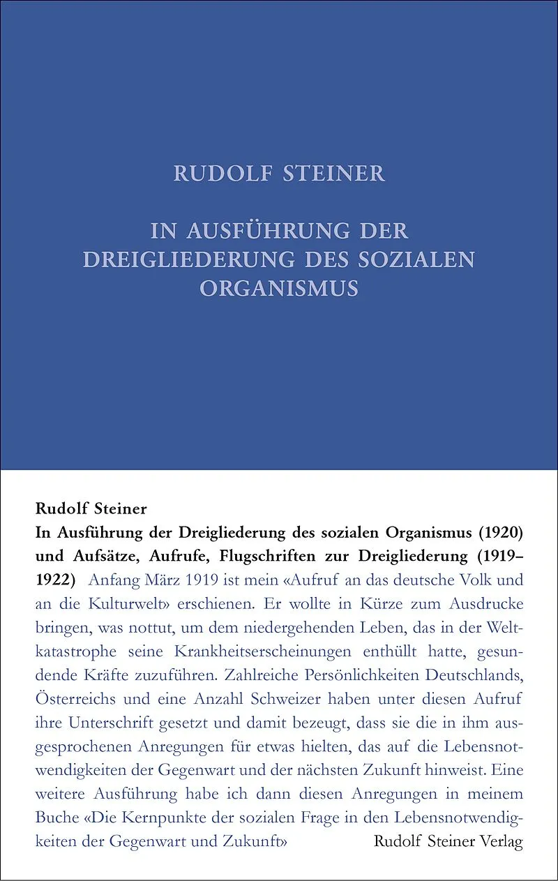 Das Schrifttum zur Dreigliederung - jetzt chronologisch geordnet Die letzte Ausgabe des Bandes GA 24 ist 1982 erschienen. Für die neue, dritte Auflage wurde er vollständig überarbeitet; die Schrift 'Gedanken während der Zeit des Krieges' wurde zusammen mit weiteren Texten zum Weltkriegsgeschehen ausgegliedert und dem in der Gesamtausgabe erschienenen Band GA 19 zugeordnet. Der Band trägt neu den Titel, den Rudolf Steiner selbst seiner 1920 zusammengestellten Aufsatzsammlung gegeben hat. Eine weitere wesentliche Neuerung ist die chronologische Anordnung der in dem Band GA 24 abgedruckten Aufsätze. So lässt sich nun der Weg von Rudolf Steiners öffentlichem Kampf für die Dreigliederung Jahr für Jahr mitverfolgen. Alle Texte wurden sorgfältig mit der Ausgabe letzter Hand verglichen und, wo nötig, rückkorrigiert. Beim Aufsatz 'Staatspolitik oder Menschheitspolitik' wird neu der französische Erstdruck publiziert, gefolgt von der deutschen Manuskriptfassung. Dem Band ist am Ende ein Verzeichnis aller Aufsätze Rudolf Steiners zu sozialen Fragen und zu Zeitfragen beigegeben. Weitere Dokumente wie Titelseiten und Abbildungen von Erstdrucken vervollständigen die Ausgabe.