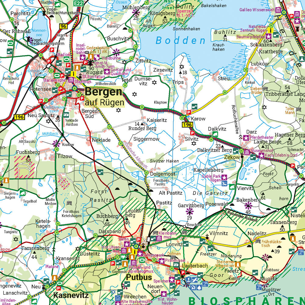 Mit der Freizeitkarte Rügen können Sie Ihre Ausflüge und Touren ideal planen und sich über alle Sehenswürdigkeiten auf Deutschlands größter Insel informieren. Der Erlebnisführer auf der Rückseite beschreibt alle wichtigen Ausflugsziele. Informationen zur Freiz...