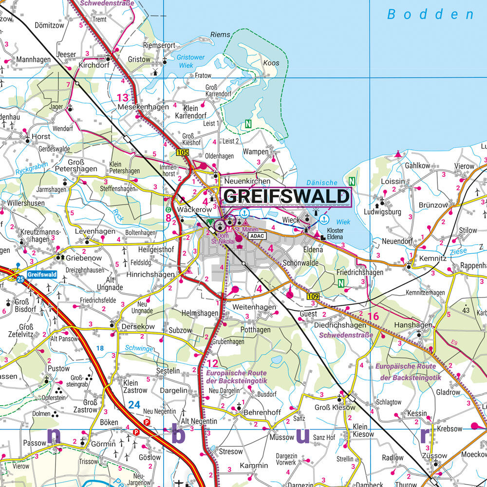 Die Straßenkarte Rügen - Mecklenburg-Vorpommern im Maßstab 1:150.000 enthält alle wichtigen Informationen für Urlauber die Norddeutschland mit Auto, Motorrad oder Wohnwagen besuchen möchten. Das umfassende Straßennetz ist präzise dargestellt, Touristenstraßen ...