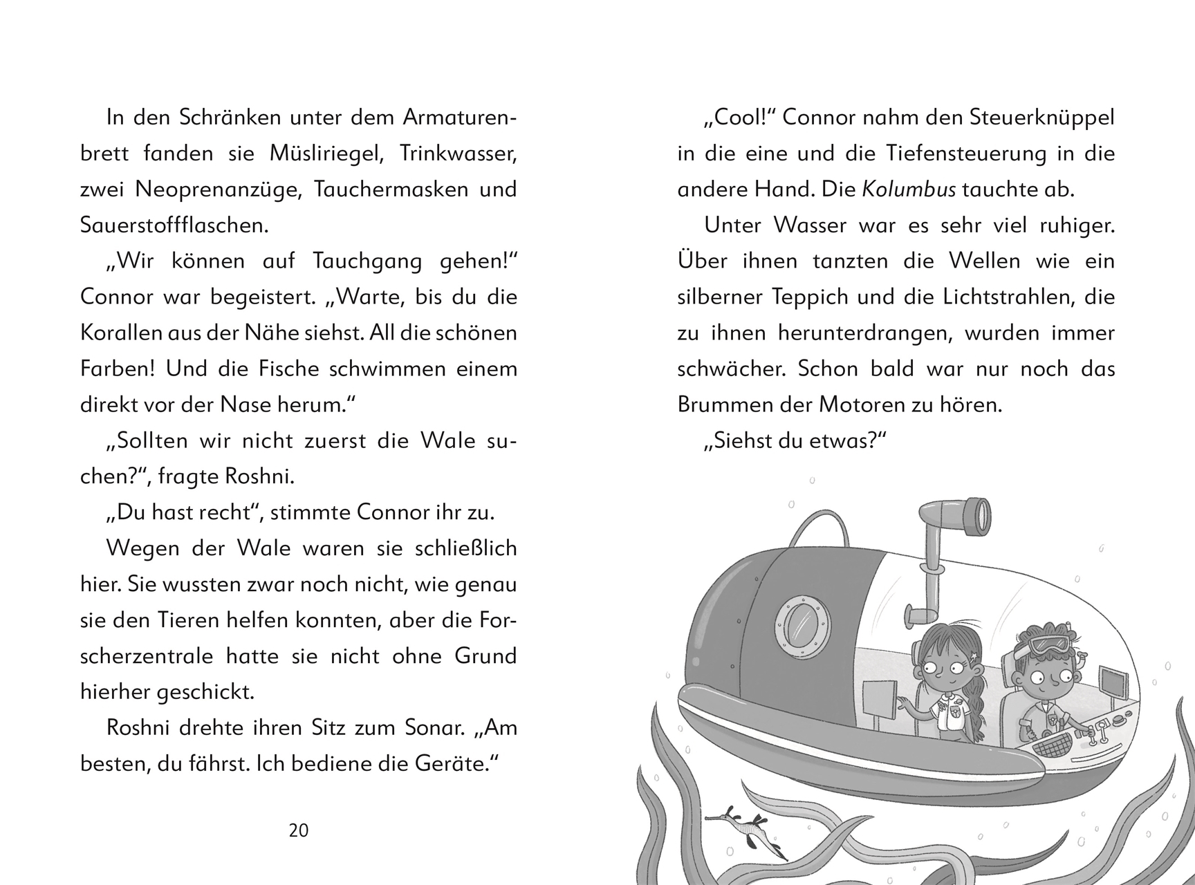 Ein Fall für Meeres-Experte Connor: Im Pazifik hat sich eine Gruppe Wale gefährlich weit von ihrem Kurs entfernt. Sofort starten Connor und Weltraum-Expertin Roshni von der geheimen Forscherzentrale, um die Wale zu retten. Doch zuerst müssen sie ein vermisstes Walbaby finden und dann geht auch noch ihr U-Boot kaputt. So schwierig hatten sich die beiden die Mission nicht vorgestellt Leseabenteuer mit den Forscher-Kids ein fesselnder Mix aus **Action, Magie und Sachwissen.