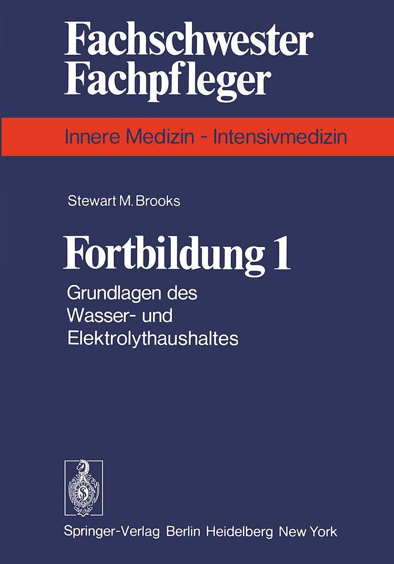 Mit den "Grundlagen des Wasser-, Elektrolyt-und Saure/ Basen-Haushaltes" legen wir den ersten Fortbildungsband der Sektion Innere Medizin - Intensivmedizin der Schrif tenreihe Fachsehwester - Fachpfleger vor. Wahrend die Weiterbildungsbande dieser Sc...Mit den "Grundlagen des Wasser-, Elektrolyt-und Saure/ Basen-Haushaltes" legen wir den ersten Fortbildungsband der Sektion Innere Medizin - Intensivmedizin der Schrif tenreihe Fachsehwester - Fachpfleger vor. Wahrend die Weiterbildungsbande dieser Schriftenreihe den Grundstoff der praktischen Unterweisung und des theoretischen Un terrichtes der einzelnen Weiterbildungslehrgange in syste matischer Weise erfassen, sollen die Fortbildungsbande spezielle Probleme der Intensivmedizin eingehender dar legen. Sie sollen den Lernenden das Verstandnis flir den theoretischen Hintergrund, den Sinn und Zweck der von ihnen ausgeflihrten praktischen MaBnahmen vertiefen und dem Lehrenden die Erarbeitung des Lehrstoffs und die Durchfiihrung des Unterrichts erleichtem. Die Fortbildungsbande sollen iiber das unmittelbare An liegen der Weiterbildung hinaus allen in der Intensivmedi zin tatigen Schwestem, Pflegem und Arzten eine Hilfe bei der Ausiibung ihres taglichen Dienstes sein. Oktober 1977 Die Herausgeber VII Vorwort zur driften amerikanischen AuOage In diesem Buch werden die physiologischen Grundlagen des Fliissigkeits- und Elektrolythaushalts kurz und leicht versHindlich dargestellt und Richtlinien zur Infusionsthe rapie gegeben. Der Leser sollte immer daran denken, daB auch auf diesem Gebiet die Meinungen der Fachleute in einzelnen Punkten noch immer auseinandergehen und da her keine Lehrmeinung ein absolutes Dogma sein kann. Ich hoffe, daB die vorliegende, iiberarbeitete, dritte Aus gabe den Anklang findet, der der zweiten zuteil wurde. Waban, Massachusetts, Januar 1973 Stewart M. Brooks IX InhaItsverzeichnis 1. Einleitung . . . . . . . . . . . . . . . . . . . . 1 . . . . 2. Wasser 2 2.1. Gesamtk6rperwasser 2 2.2. 2 Fliissigkeitsriiume . . 2.3. Fliissigkeitsverschiebungen zwischen den F1iissigkeitsriiumen und Osmose. . . . . . 3 2.4. F1iissigkeitsverschiebungen im Magen-Darm-Trakt .