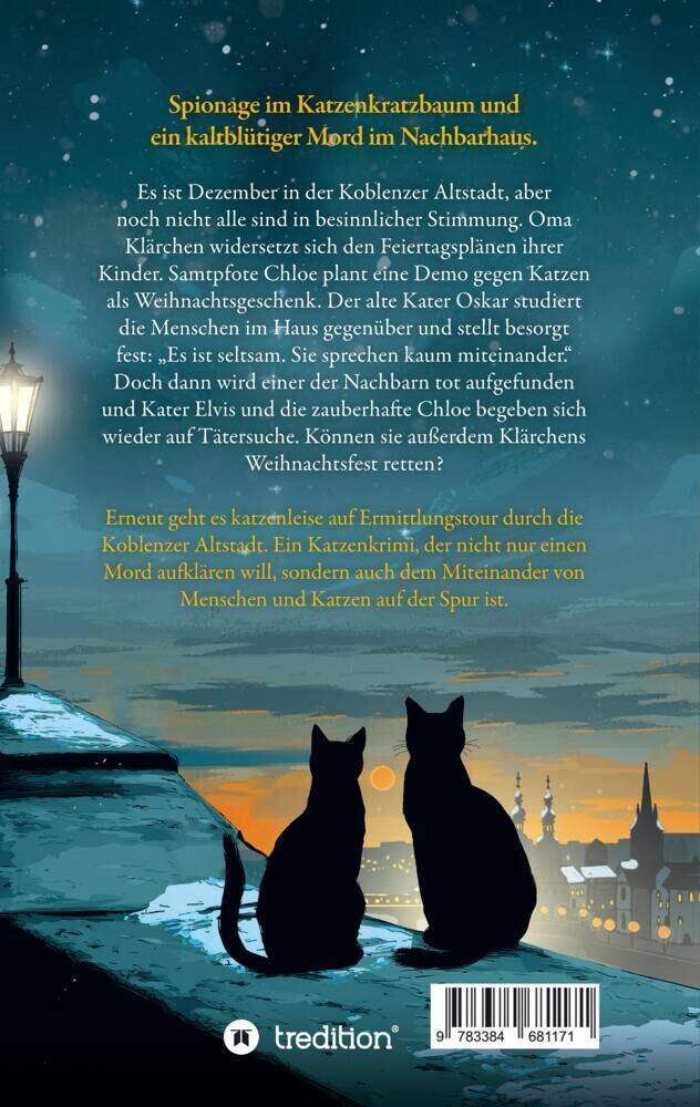 Spionage im Katzenkratzbaum und ein kaltblütiger Mord im Nachbarhaus. Es ist Dezember in der Koblenzer Altstadt, aber noch nicht alle sind in besinnlicher Stimmung. Oma Klärchen widersetzt sich den Feiertagsplänen ihrer Kinder. Samtpfote Chloe plant eine Demo ...