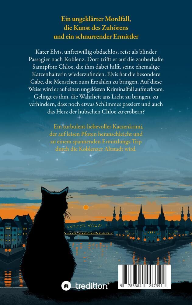 Ein ungeklärter Mordfall, die Kunst des Zuhörens und ein schnurrender Ermittler Kater Elvis, unfreiwillig obdachlos, reist als blinder Passagier nach Koblenz. Dort trifft er auf die zauberhafte Samtpfote Chloe, die ihm dabei hilft, seine ehemalige Katzenhalter...