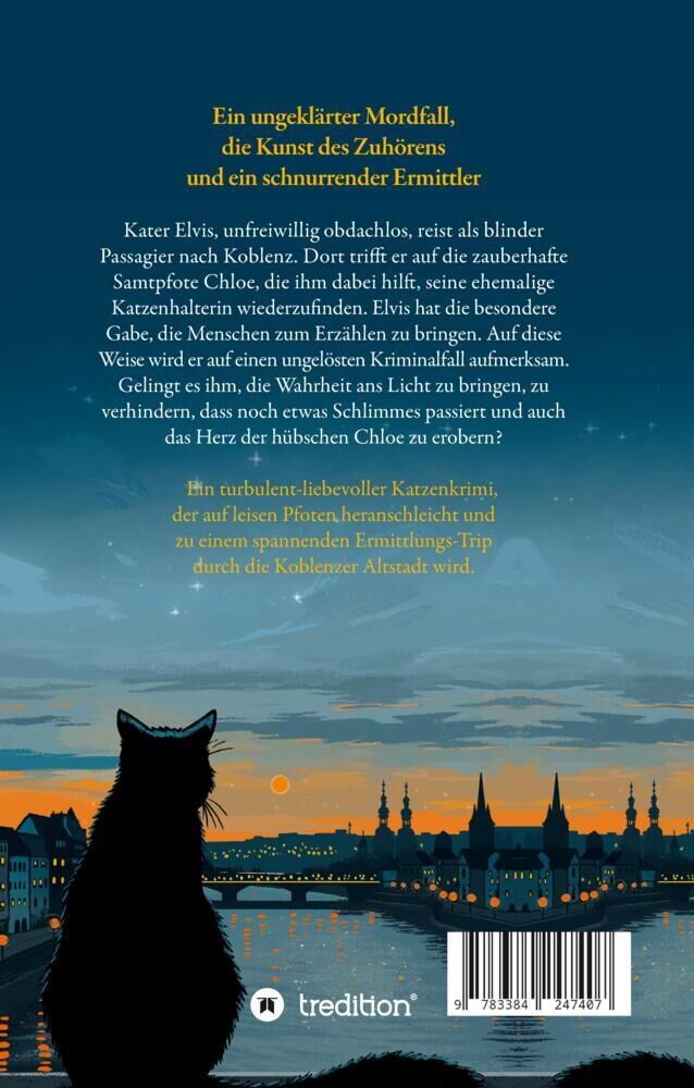 Ein ungeklärter Mordfall, die Kunst des Zuhörens und ein schnurrender Ermittler Kater Elvis, unfreiwillig obdachlos, reist als blinder Passagier nach Koblenz. Dort trifft er auf die zauberhafte Samtpfote Chloe, die ihm dabei hilft, seine ehemalige Katzenhalter...