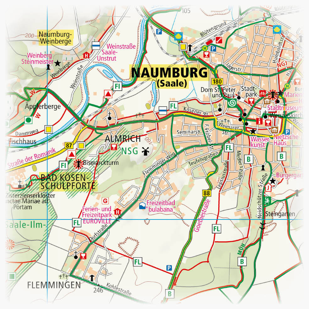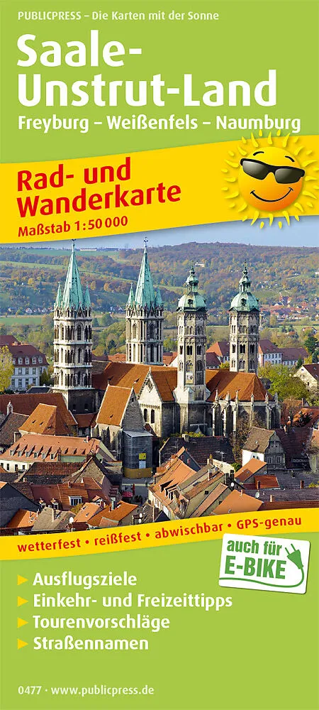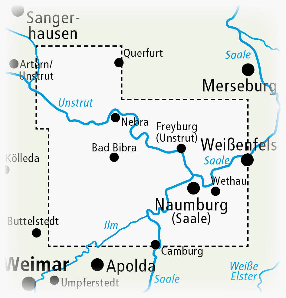 Die Rad- und Wanderkarte präsentiert im Kartenausschnitt Rad- und Wanderwege rund um den Naturpark Saale-Unstrut-Triasland. Das regenarme Gebiet lädt zu Wanderungen und Radtouren entlang der Flüsse, durch die hügeligen Wälder oder die terrassenförmigen Weinber...