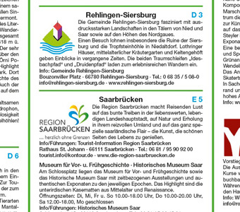 Der Erlebnisführer Saarland informiert umfassend über das kleine Land im Herzen Europas. Im Kartenteil markieren Fähnchen Ausflugsziele und verschaffen einen Überblick über die Landschaft: Mosel, Saar, der Naturpark Saar-Hunsrück, Städte wie Saarbrücken, Saarl...