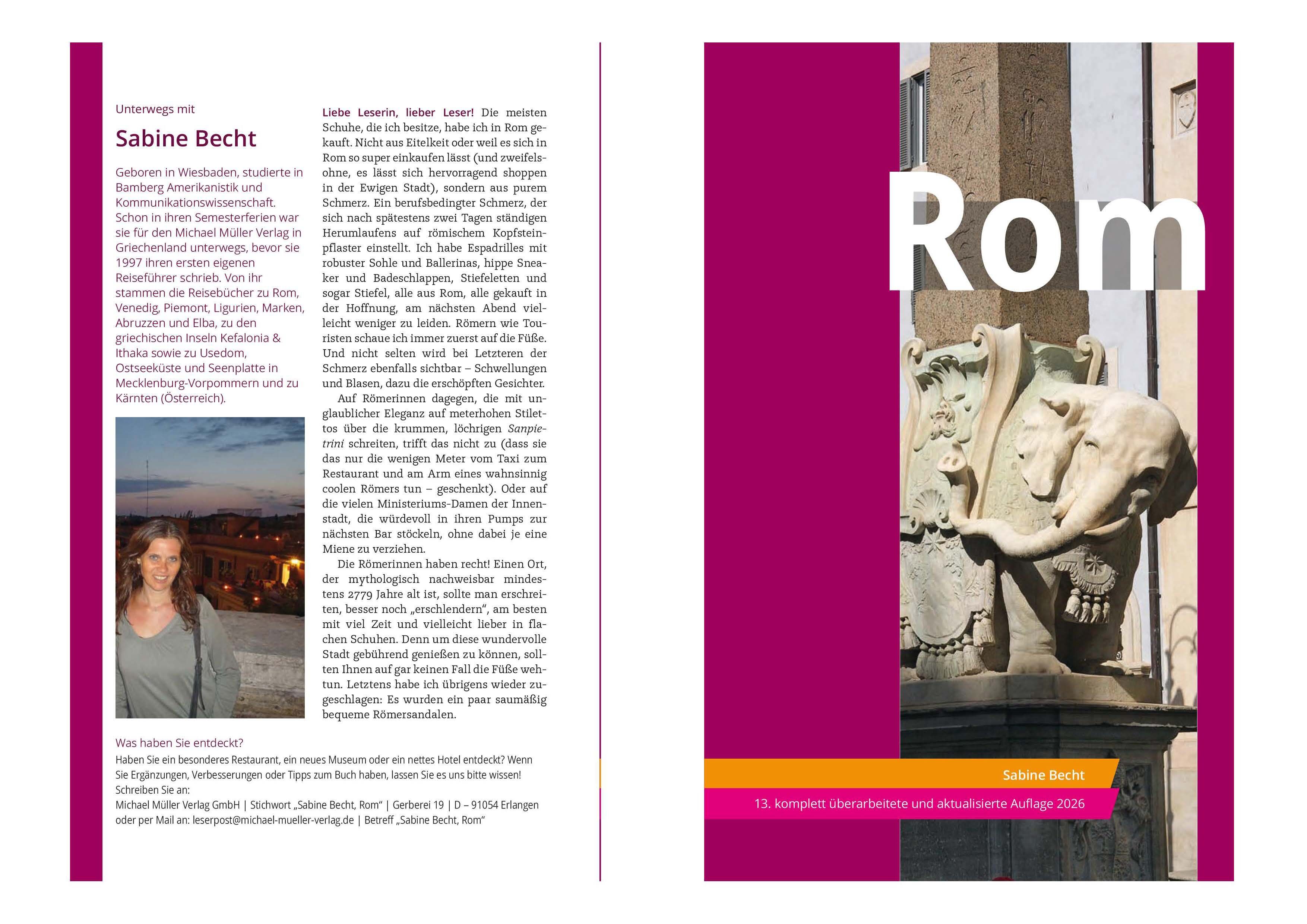 Rom, die Ewige Stadt angesichts einer nachweisbar fast 3000-jährigen Stadtgeschichte kein übertriebenes Prädikat. Der Reiseführer Rom der Autorin Sabine Brecht nimmt Sie mit in diese geschichtsträchtige Stadt der sieben Hügel. Die elfte Auflage ist auf 324 Seiten mit 182 Farbfotos prall gefüllt mit akribisch recherchierten Informationen und Geheimtipps allesamt für Sie vor Ort ausprobiert. So wird Ihr Rom-Urlaub individuell wie Sie selbst es sind. Dank 39 Karten inklusive herausnehmbarem Stadtplan im Maßstab 1:11.500 samt Plan der öffentlichen Verkehrsmittel sind Sie so gut orientiert wie die Einheimischen. Zehn Touren durch die Stadt, sowie Ziele rund um die Innenstadt und Ausflüge in das römische Umland lassen keine Wünsche offen. Restaurants und andere Betriebe, die ökologisch, regional und nachhaltig wirtschaften, sind hervorgehoben.
