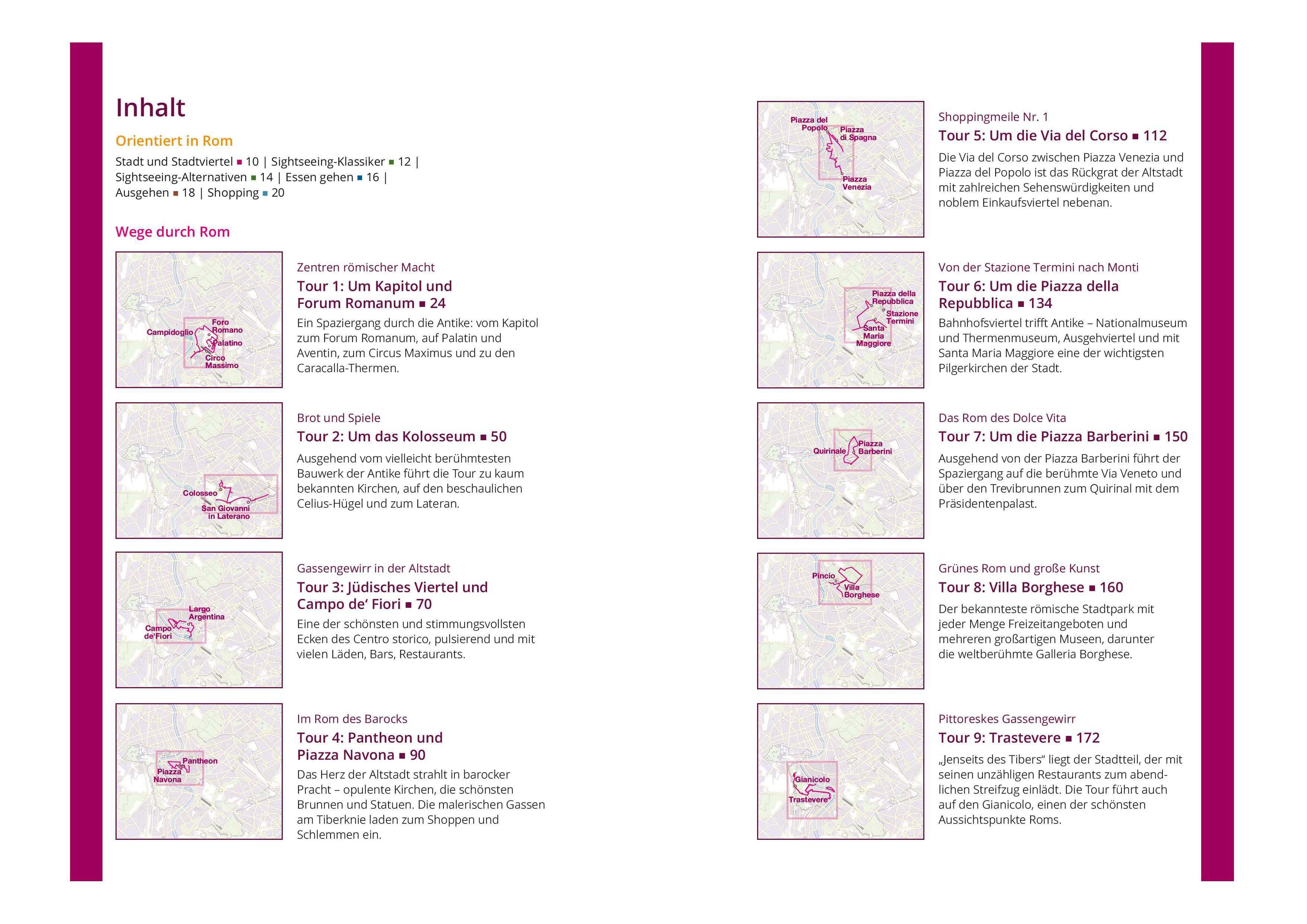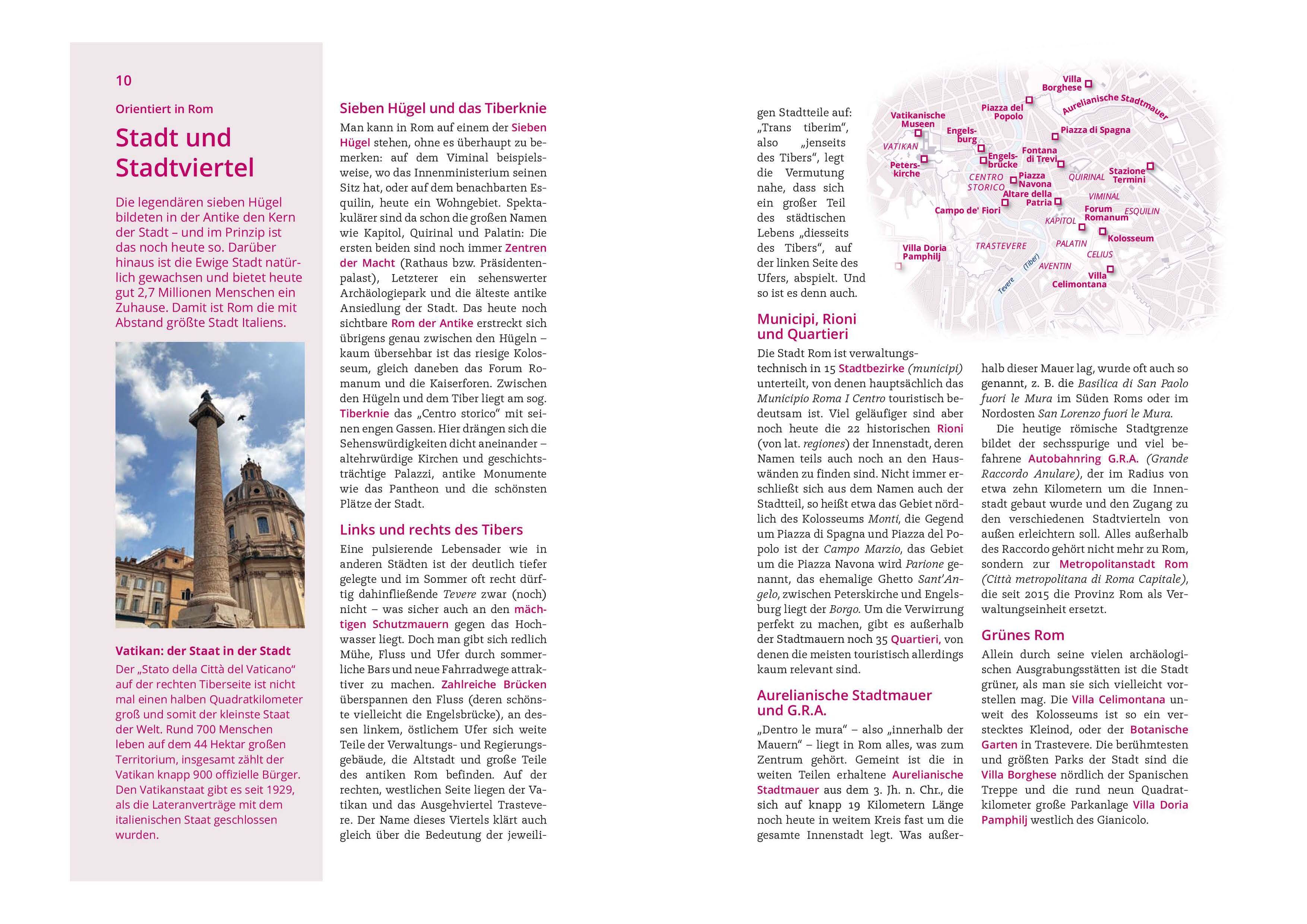 Ganz Rom in der Übersicht: Unser Reiseführer Rom kennt alles: Die Zentren römischer Macht, Kapitol, Forum Romanum, Palatin und Aventin. Brot und Spiele rund um das Colosseum Roms, den Celius-Hügel und den Lateran. Die Altstadt mit jüdischem Viertel, Campo de'Fiori und Centro storico. Das barocke Rom mit Pantheon und Piazza Navona. Shopping rund um Via del Corso. Rund um die Piazza della Repubblica mit Santa Maria Maggiore. Das sonnige, mediterrane Wetter Roms lädt zu Dolce Vita rund um Piazza Barberini mit Via Veneto, Trevi-Brunnen und Quirinal. Den römischen Stadtpark mit großartigen Museen, darunter die Villa Borghese. Pittoreskes Gassengewirr in Trastevere und dem Gianicolo. Rund um den Vatikanstaat mit Engelsburg, Peterskirche, den Vatikanischen Museen und der Sixtinischen Kapelle. Rund um die Innenstadt mit unserem Rom-Reiseführer zum Monteverde, Flaminio, San Lorenzo, Via Appia Antica und mehr. Drei ausführlich beschriebene Ausflüge in die Umgebung nach Ostia Antica, Castel Gandolfo und Tivoli runden unseren Reiseführer Rom ab.
