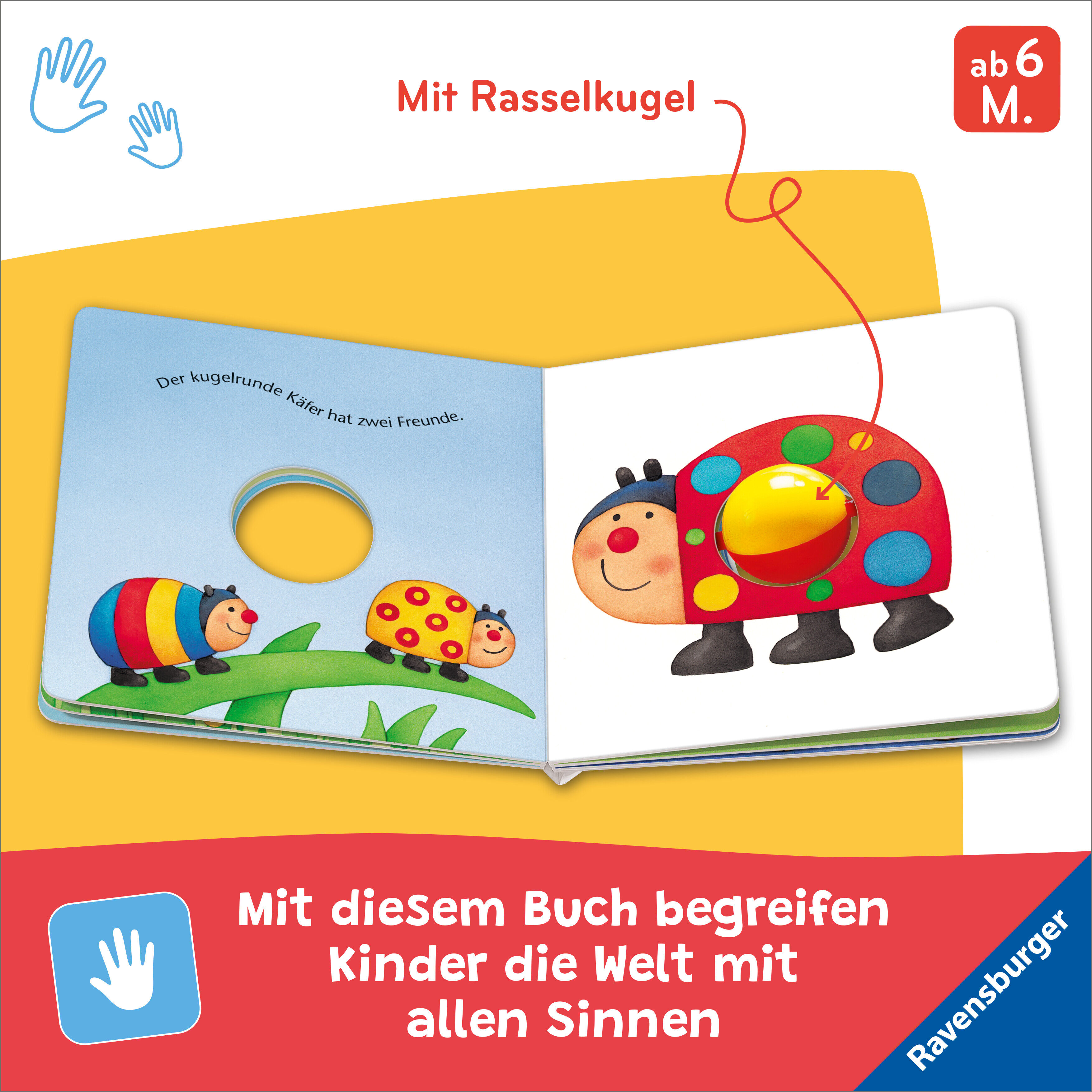 Kullern, Hören und Entdecken Nanu! Hier rasselt es lustig! Das Käferchen hat einen Kullerbauch und der Mond eine Kullernase. Die stabile orange-rote Kugel im Buch rasselt fröhlich, wenn Babys sie anstupsen und drehen. Zusätzlich gibt es viele bekannte Liebling...