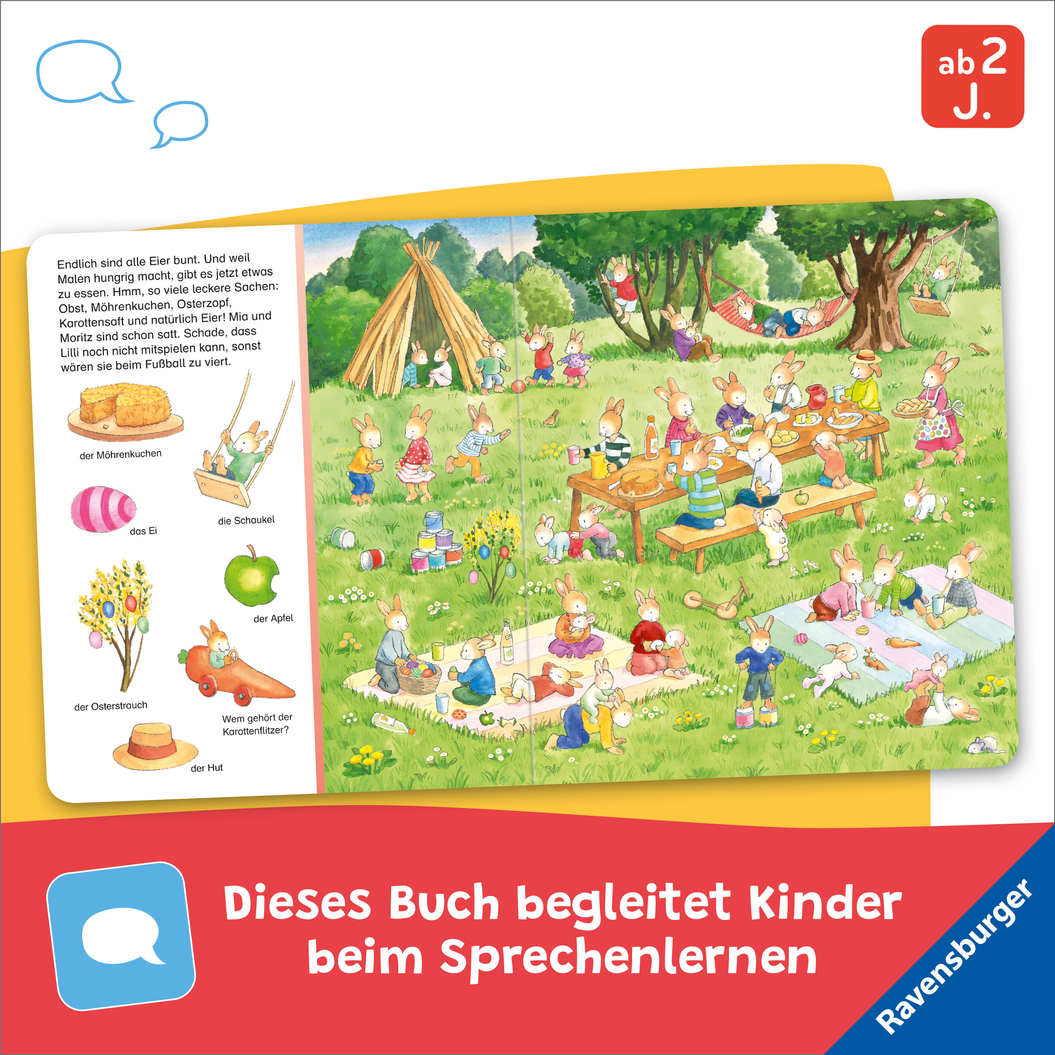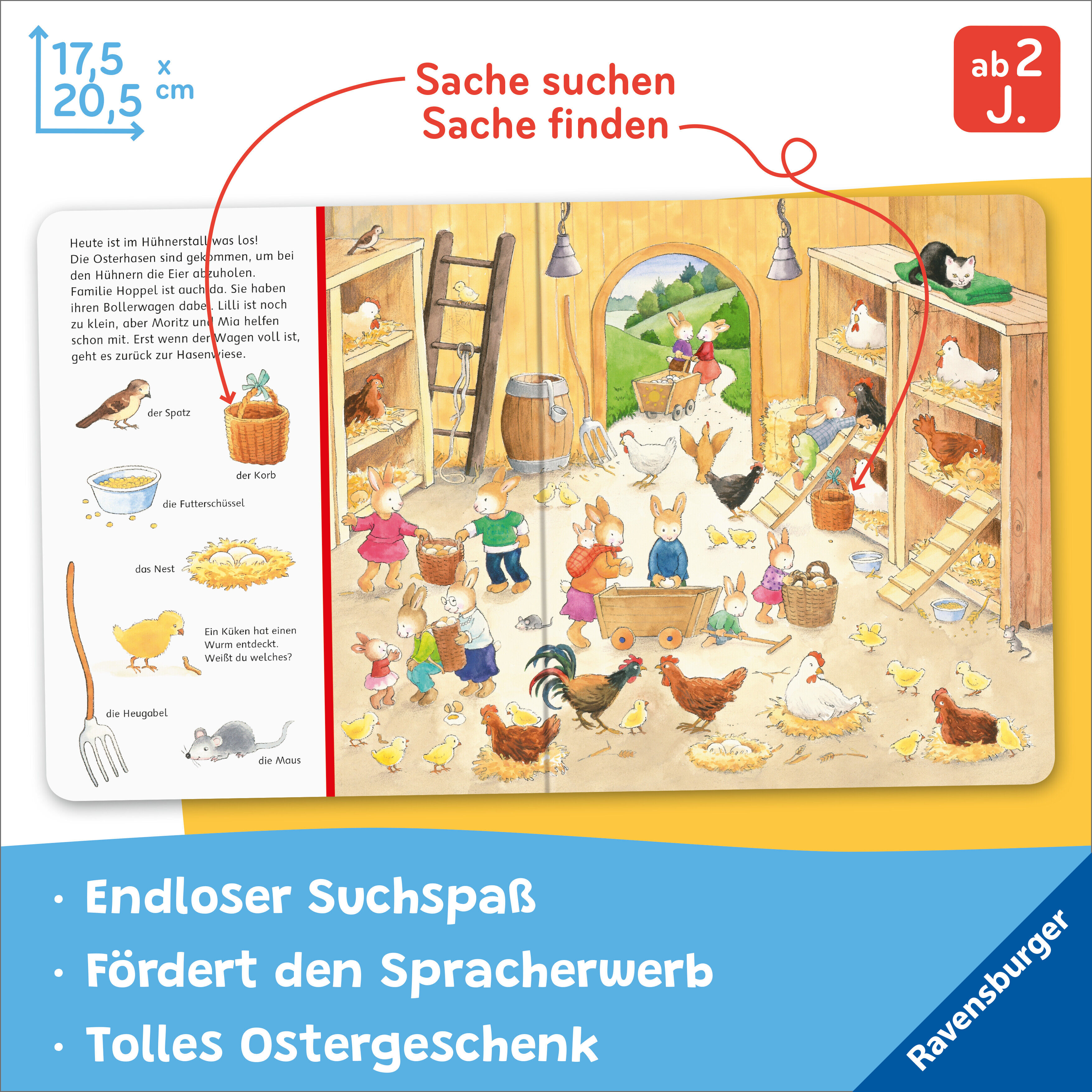 Mit Sachen suchen Ostern feiern. Auf liebevoll illustrierten, farbenfrohen Bildern gibt es alles rund um Ostern zu sehen. Im Kindergarten werden Geschenke gebastelt, zuhause wird gebacken und die Eier werden bunt gefärbt. Aber auch die Osterhasen sind fleißig....