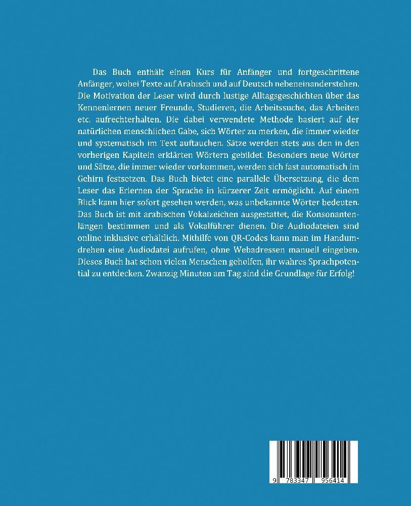 Das Buch enthält einen Kurs für Anfänger und fortgeschrittene Anfänger, wobei Texte auf Arabisch und auf Deutsch nebeneinanderstehen. Die Motivation der Leser wird durch lustige Alltagsgeschichten über das Kennenlernen neuer Freunde, Studieren, die Arbeitssuch...